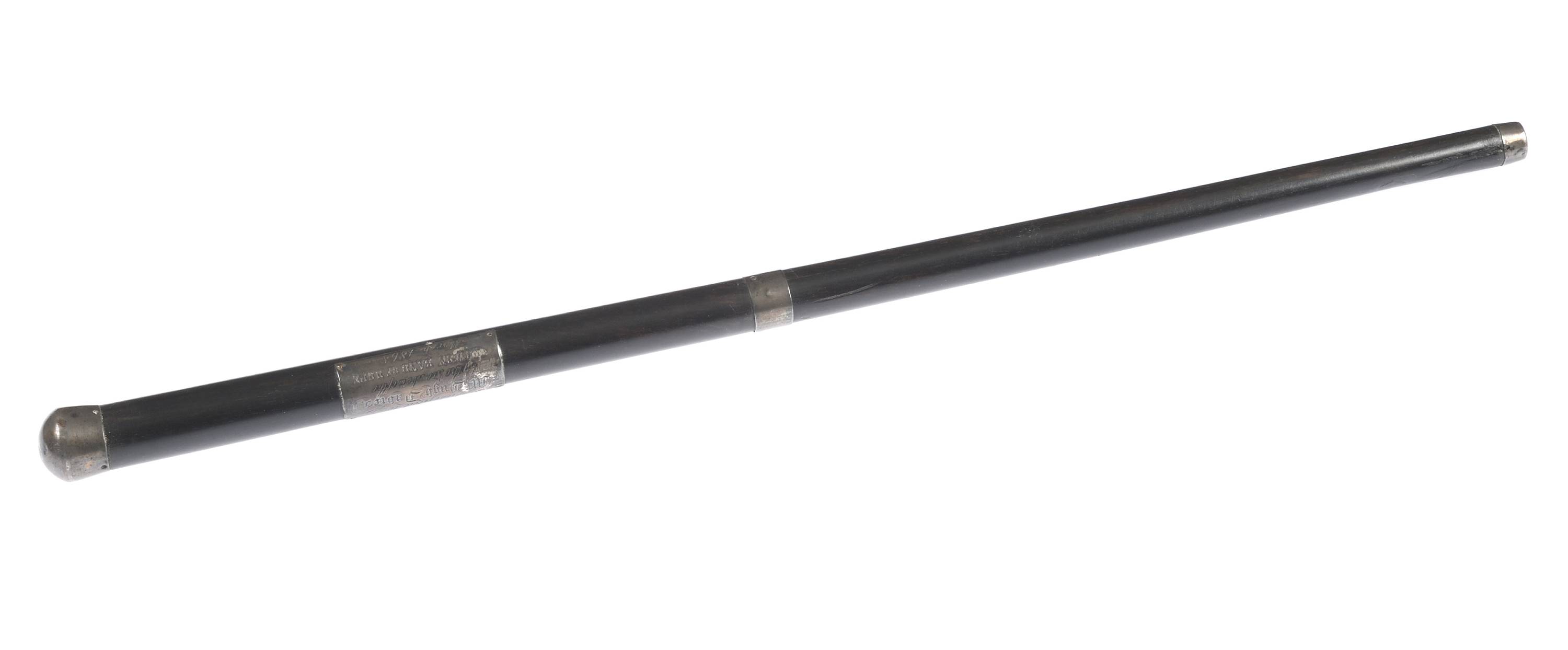 En bois d'ébène et argent. Plaque en argent gravée "Presented to Mr Hugh Dabies by the members of the CURVEN BAND OF HOPE. March 1868". L: 42 cm.