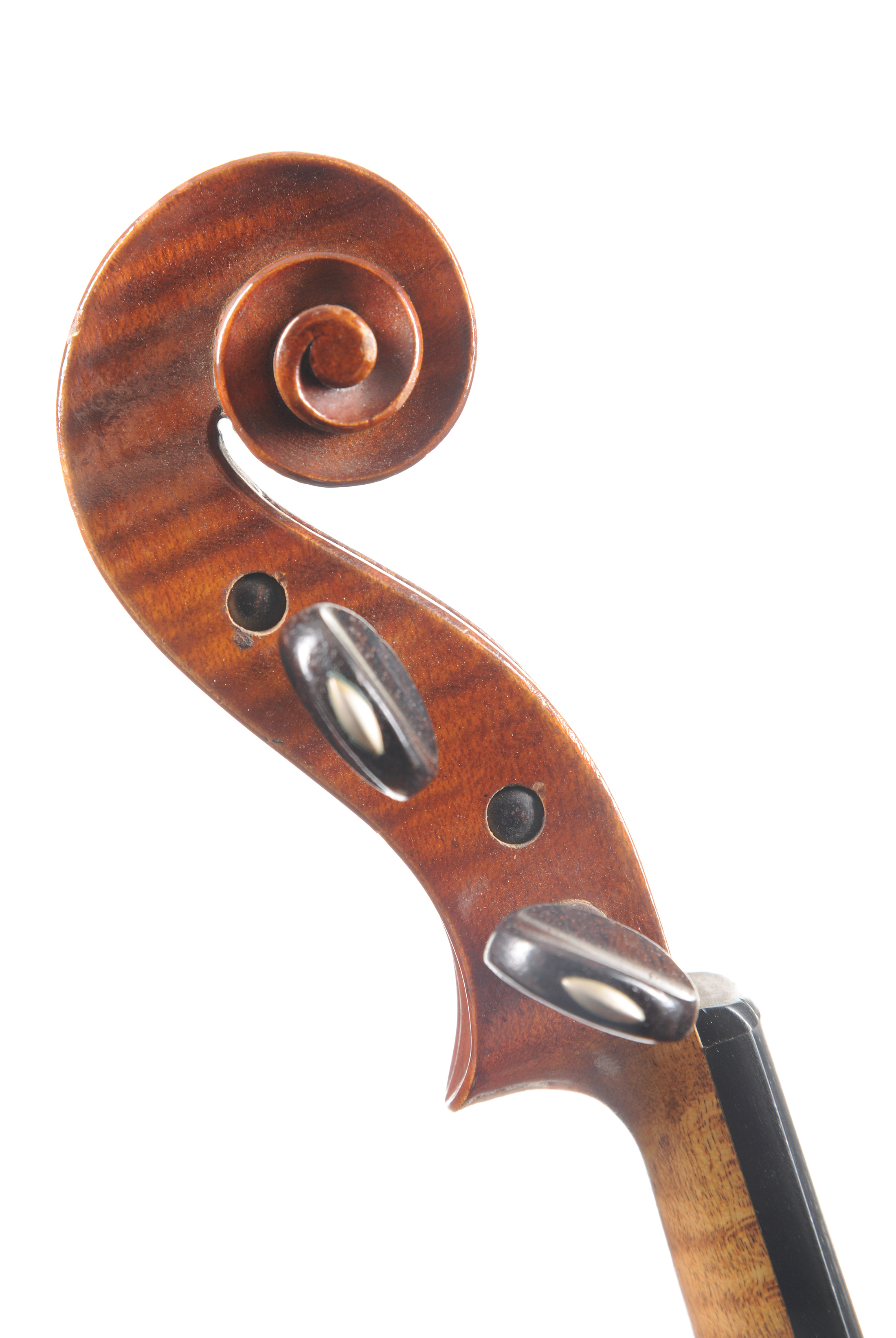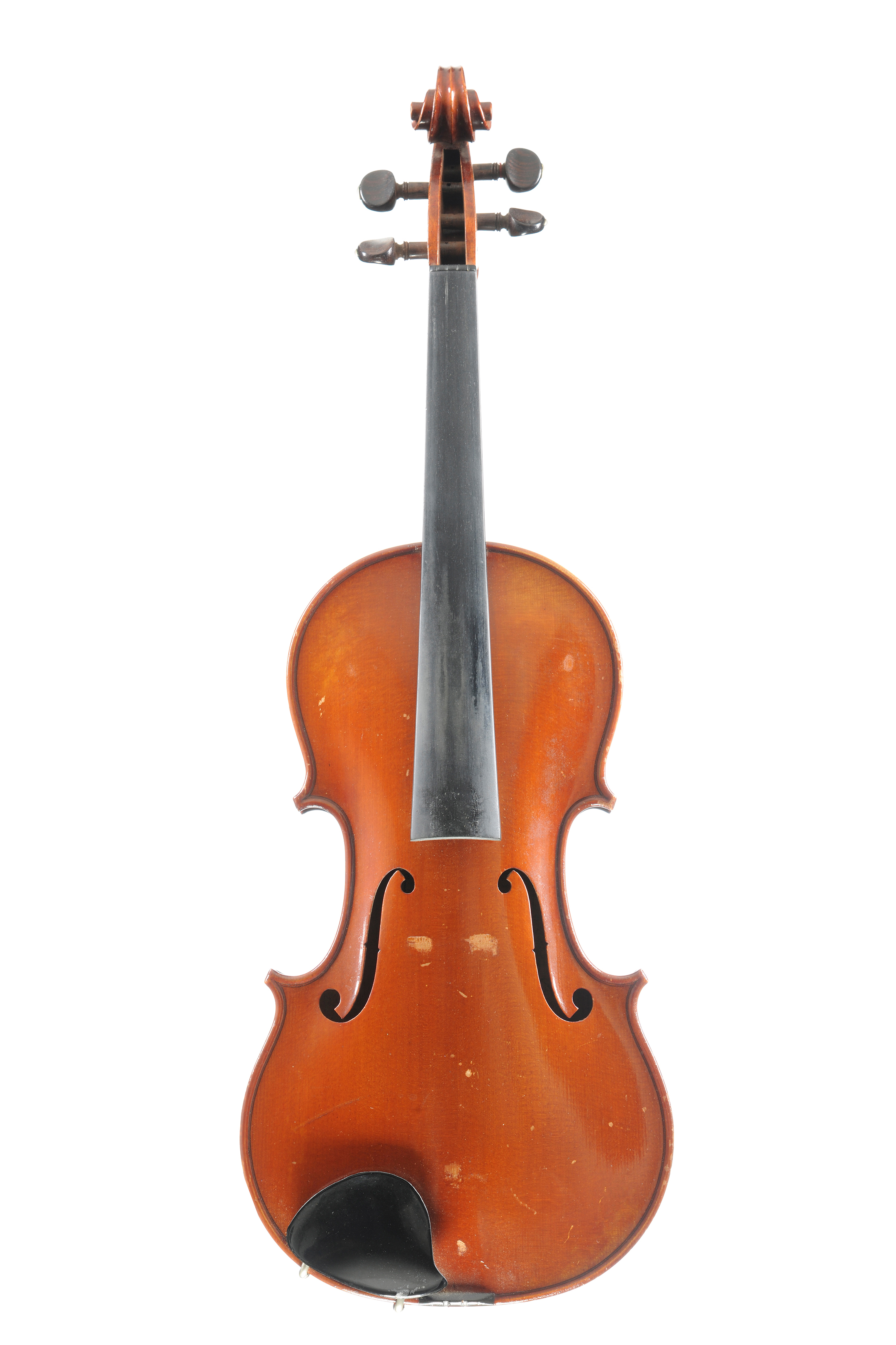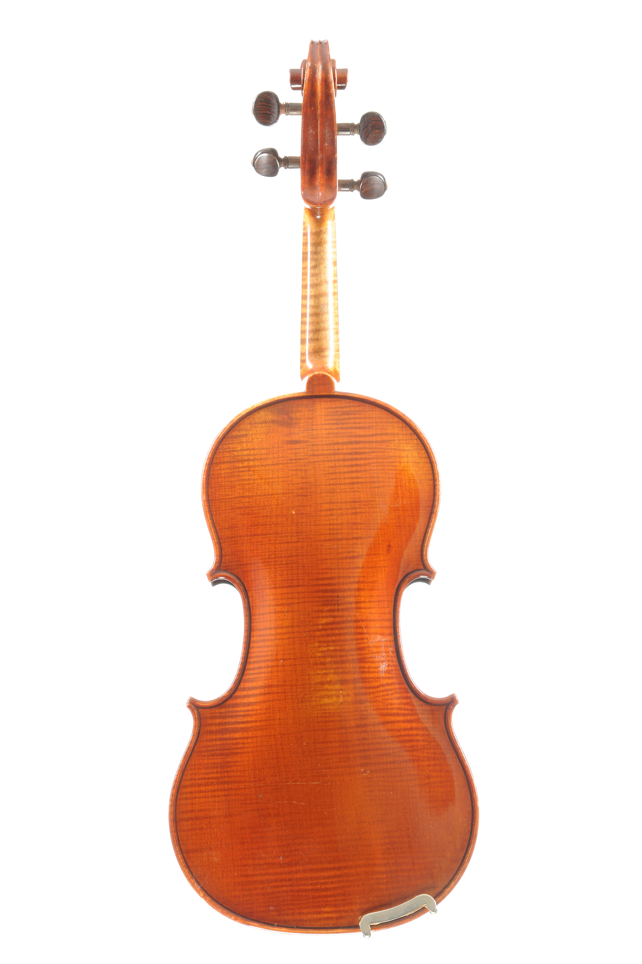 Violon fait à Mirecourt chez Couesnon pour Léon Bernardel en 1941, dont il porte l'étiquette. Fond d'une pièce en bel érable maillé, vernis brun orangé. 355 mm. Avec boite et archet.