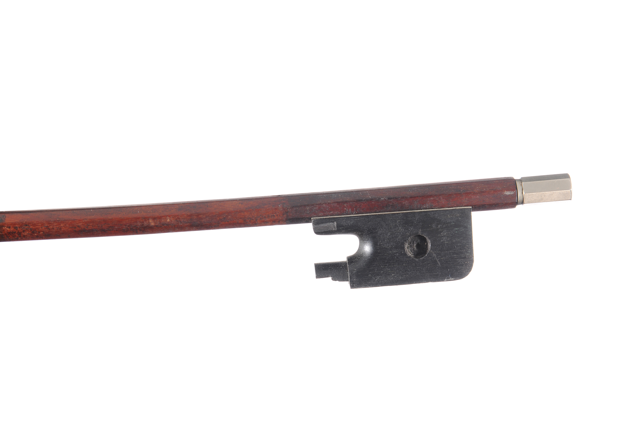Archet d'alto. Baguette ronde en pernambouc. Sans garniture, ni mèche. Hausse ébène avec grain, montée maillechort. Marque au fer de Roger-François Lotte.