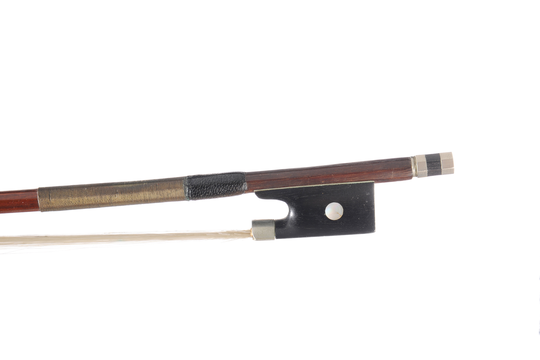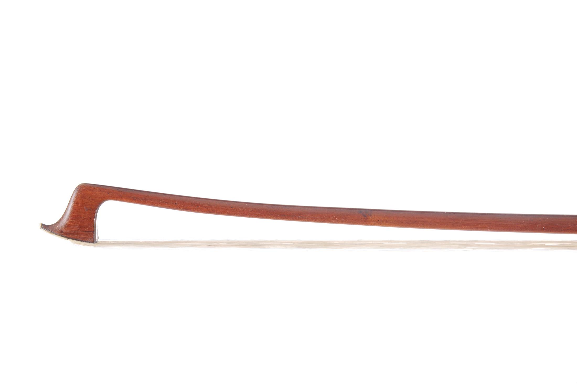 Archet de violon français. Baguette ronde en bois de pernambouc. début XXe. Hausse ébène, montée maillechort.