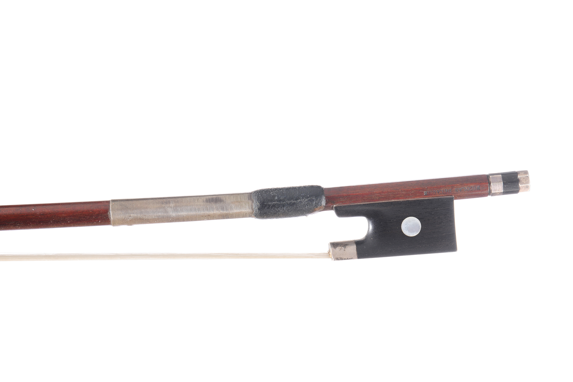 Archet de violon fait et marqué Nicolas Delaune. Baguette ronde en beau bois de pernambouc. Hausse ébène montée argent.