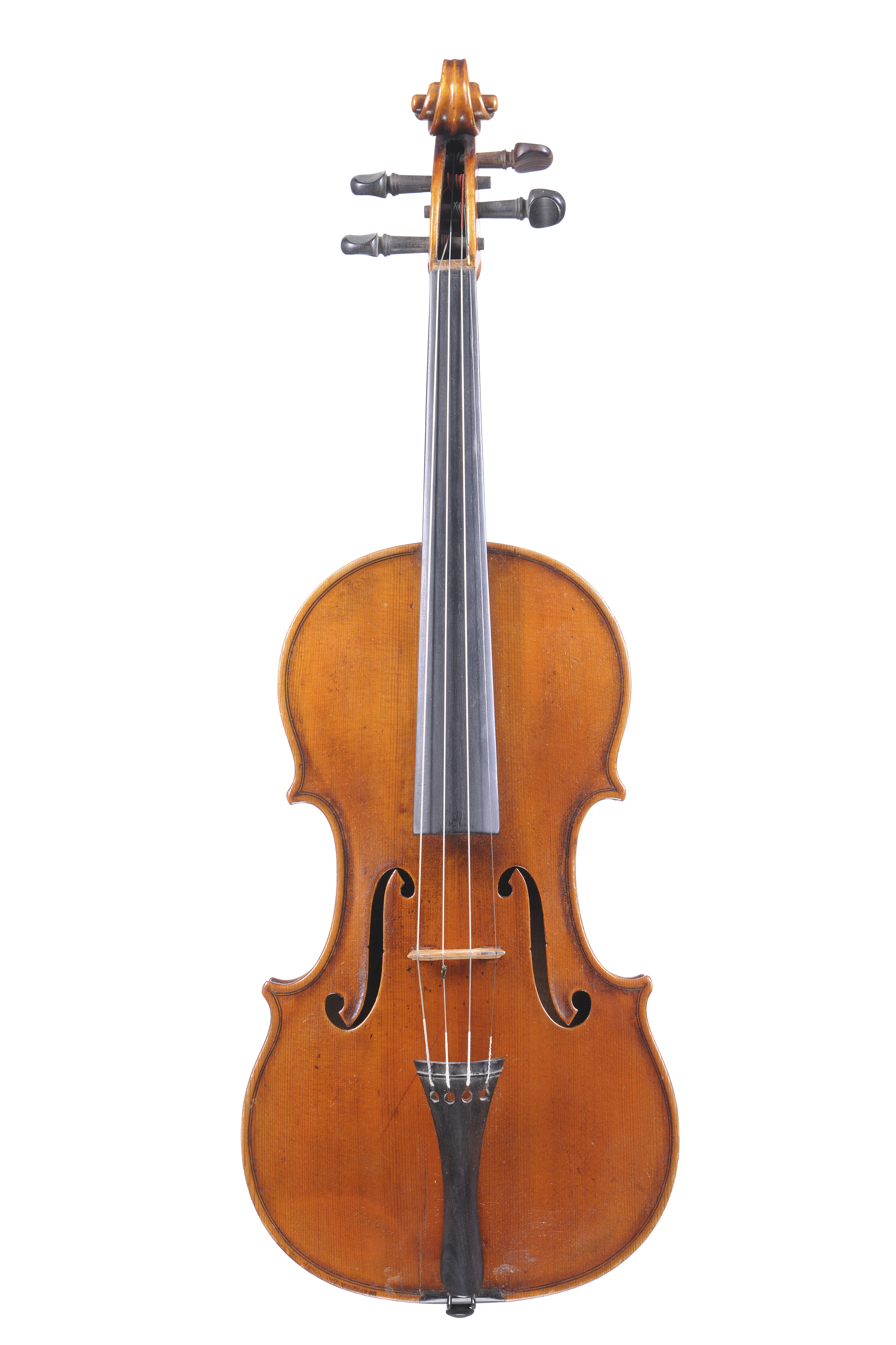 Violon portant une étiquette apocryphe de Léandro Bisiach, au millésime de 1899. Deux petites cassures à la table au niveau du sillet du bas. Fond d'une pièce. Vernis brun doré. 358 mm