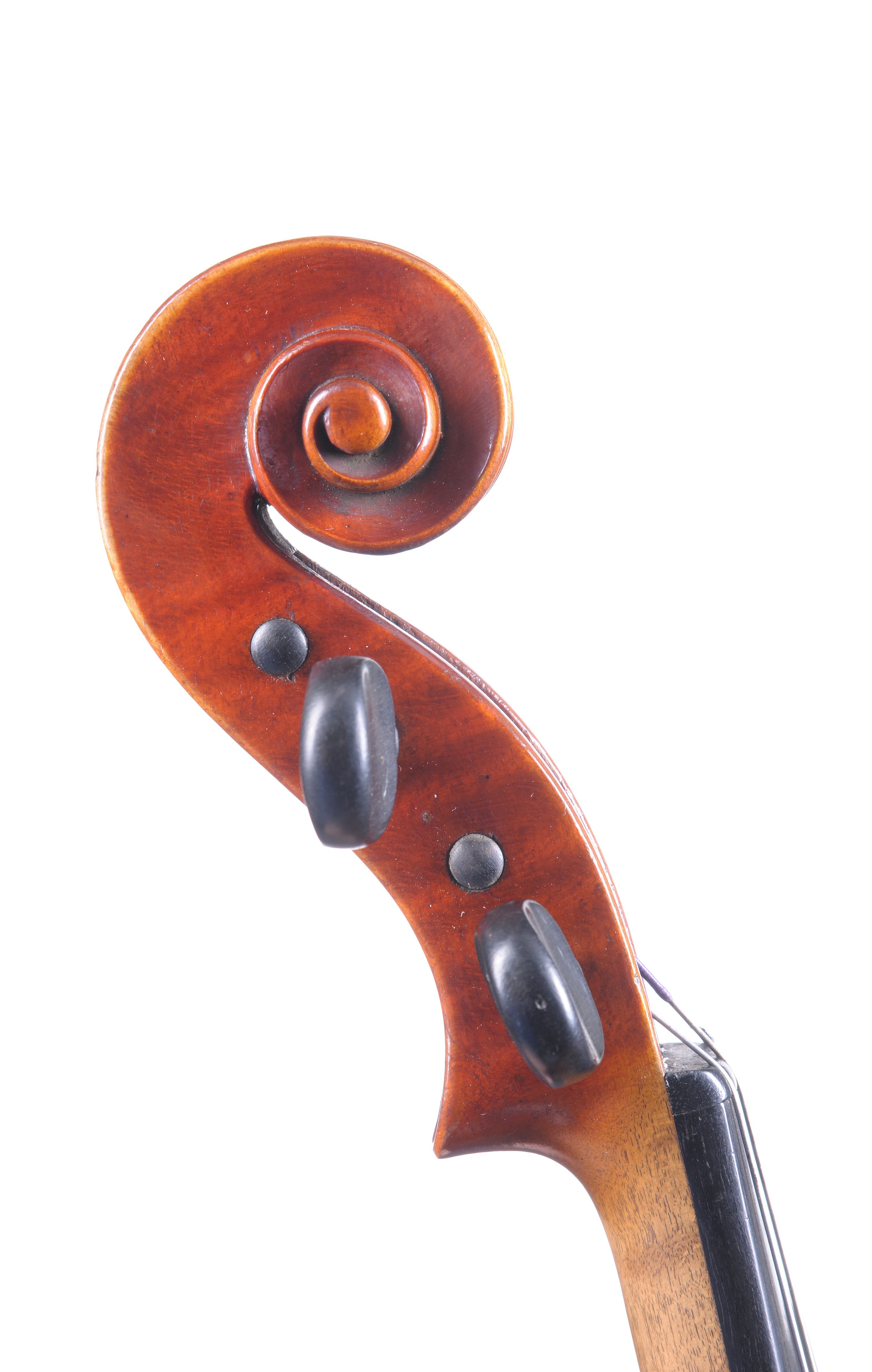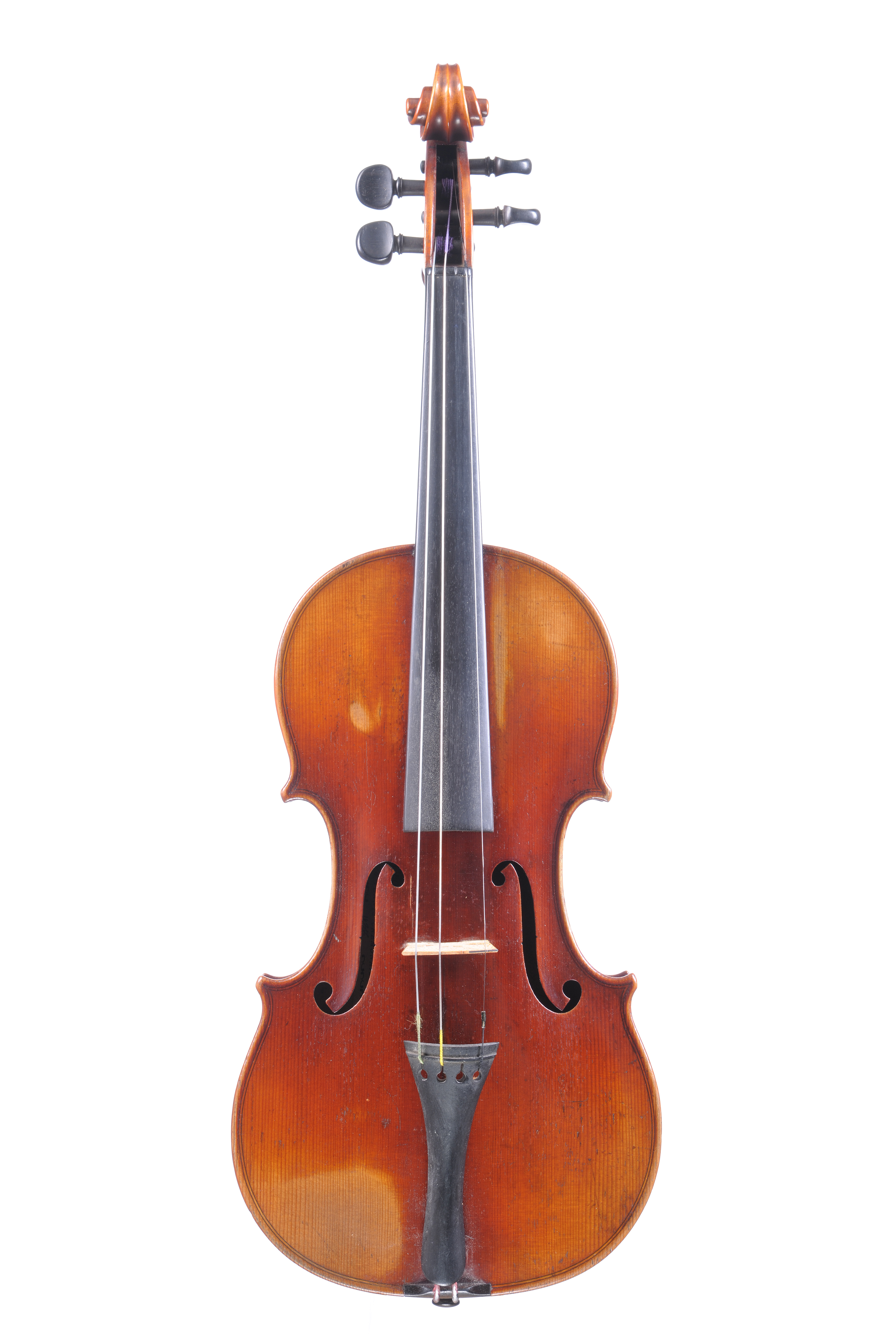 Violon fait par Georges Heynberg en 1937 à Liège, en copie de Guadagnini. Fond de deux pièces en bel érable aux ondes horizontales. Table de deux pièces aux pores serrés au centre s'élargissant sur les bords. avec un vernis brun rouge. Bon état général. 357 mm.