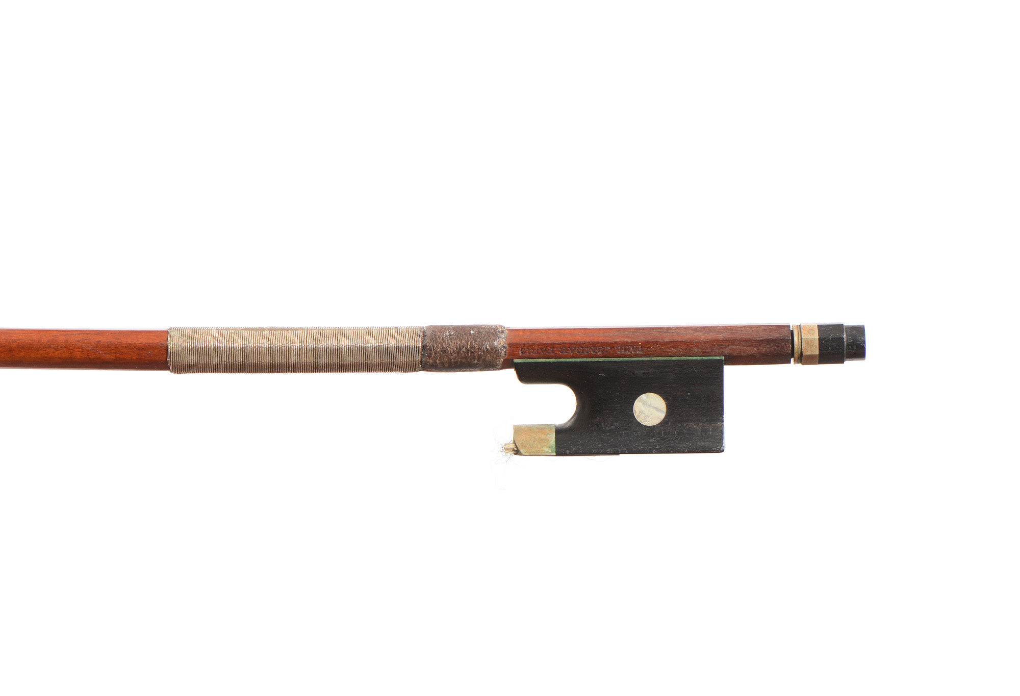fait à Mirecourt pour Paul JOMBAR à Paris, dont il porte la marque au fer. Hausse ébène montée maillechort. Il manque une virolle au bouton. Petit fel à la joue de la tête.