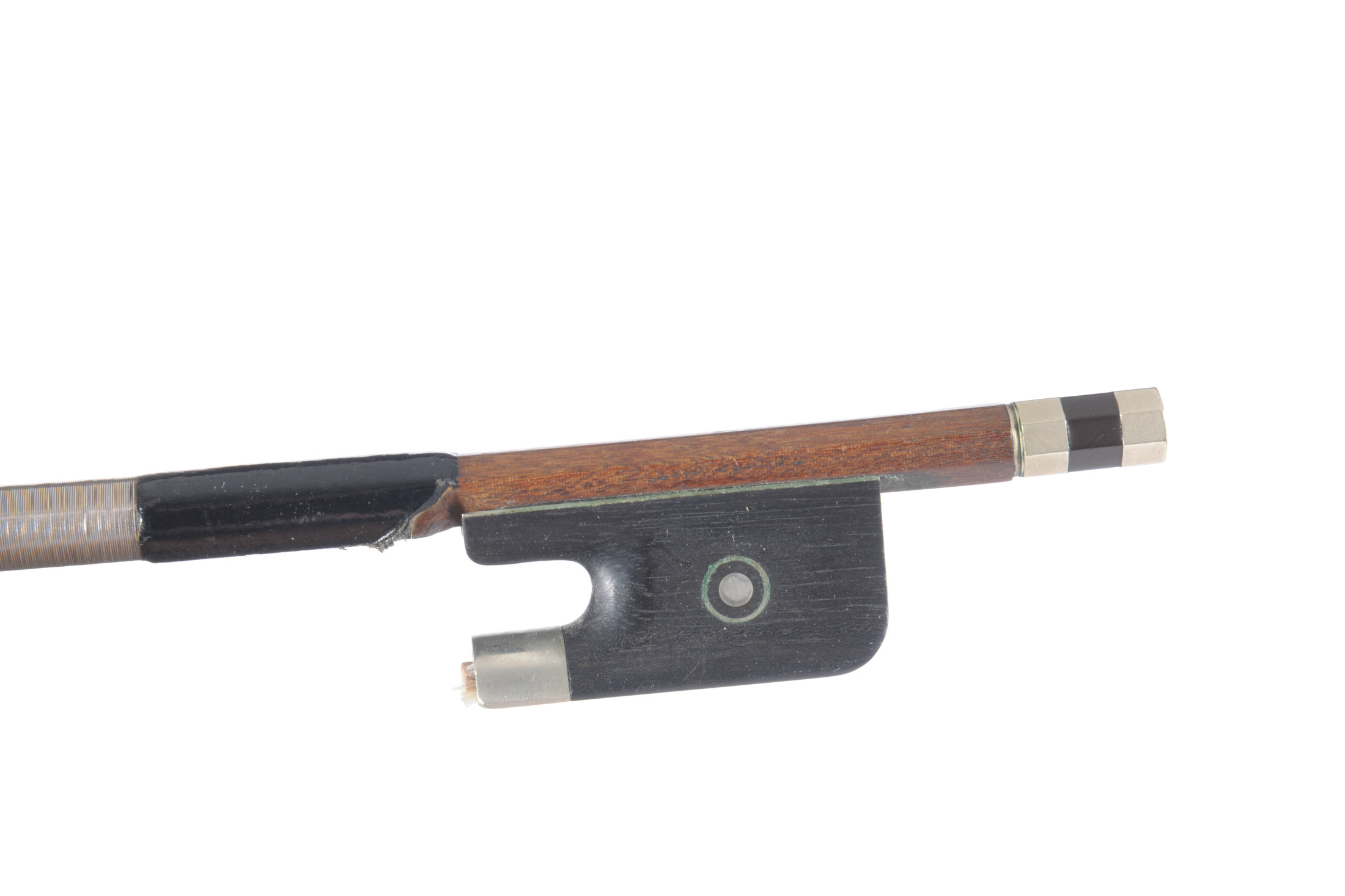 portant la marque au fer de Didier à Metz, fait vers 1950. Baguette ronde en bois de pernambouc, usure au pouce. Hausse ébène montée maillechort, bouton 2 virolles. 697 mm. 68,1g