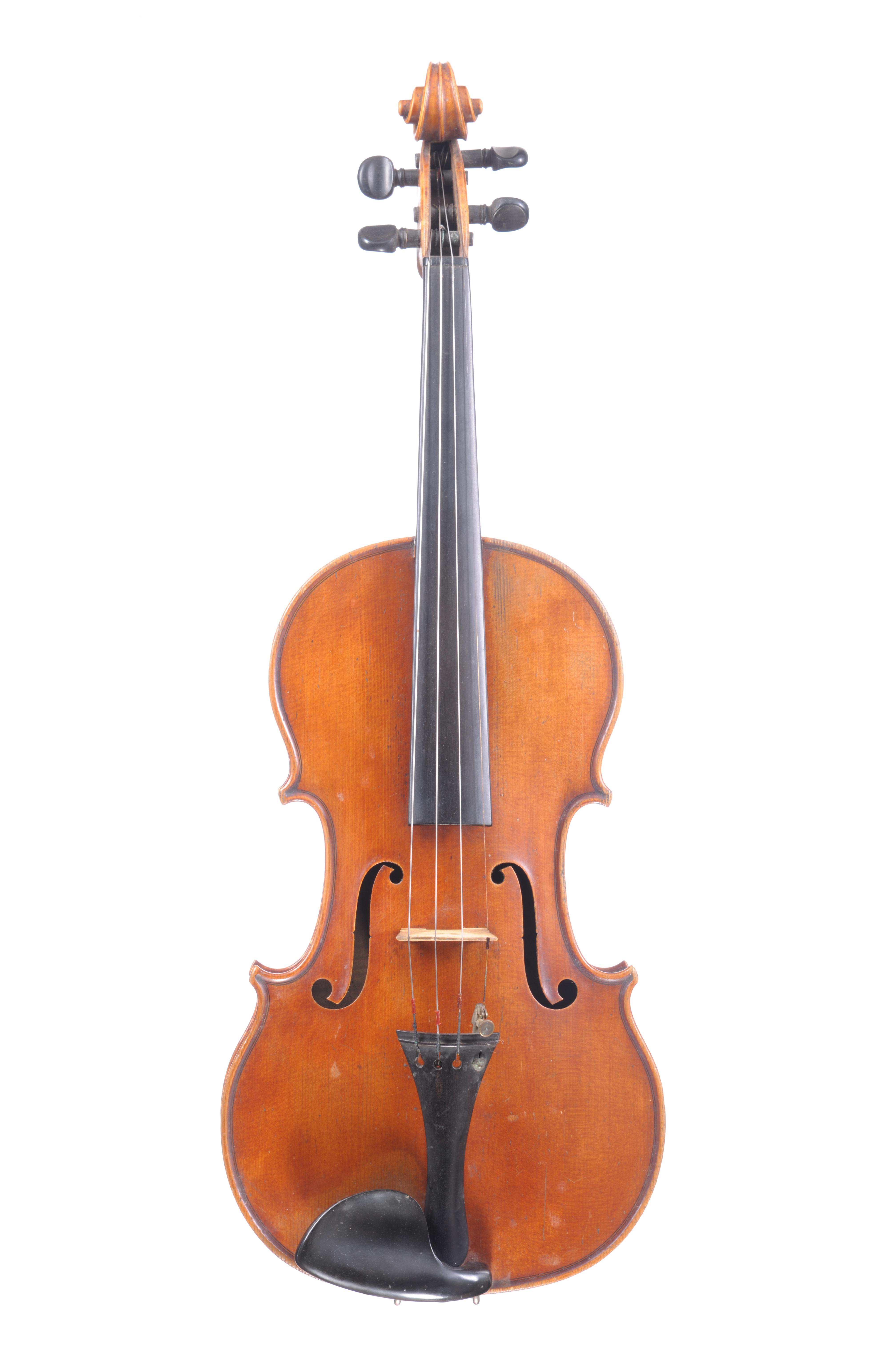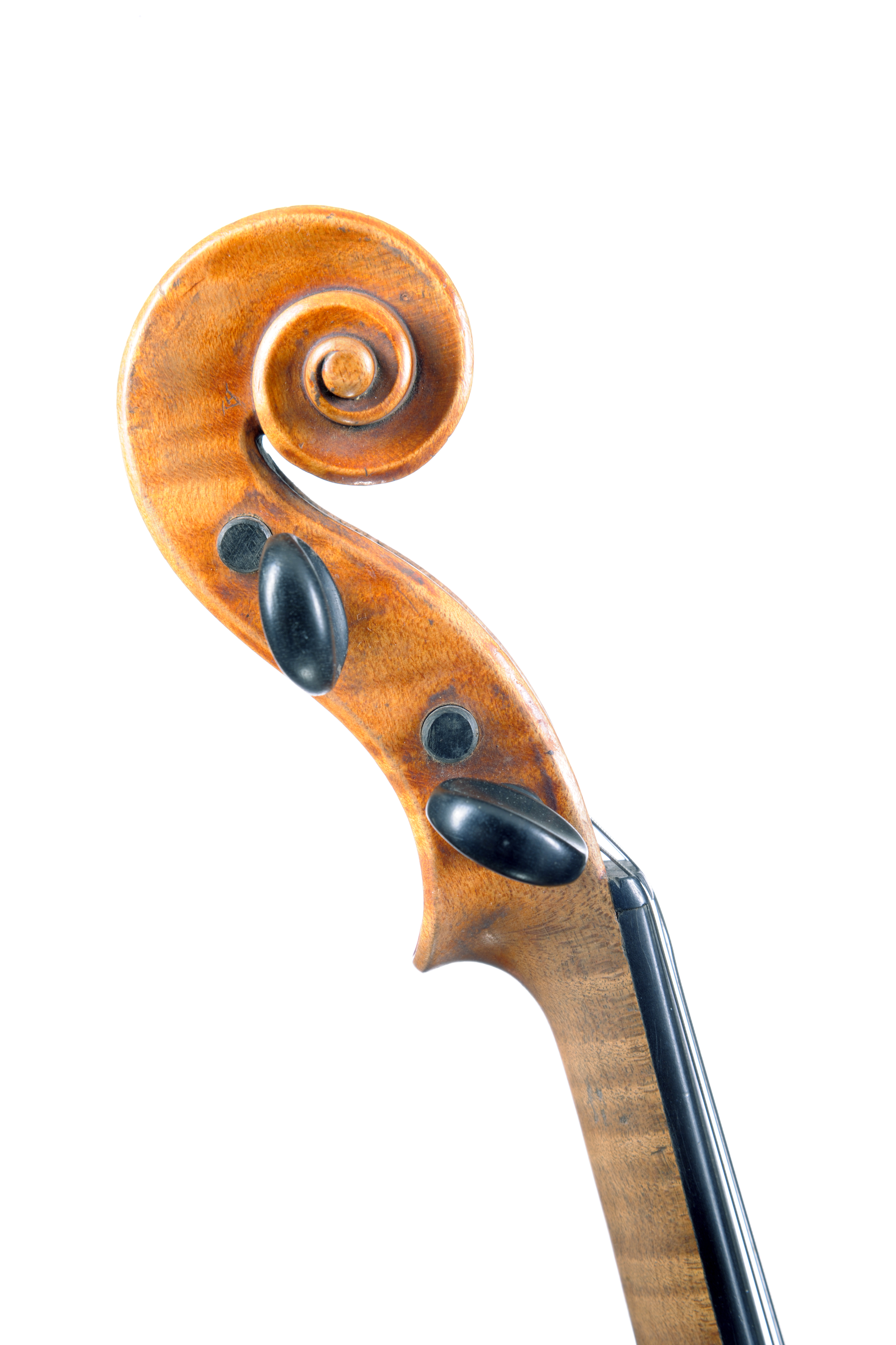 Violon de H.Derazey fait vers 1820, réparé en 1845 à Nimes par Bianchi. Fond d'une pièce, vernis brun orangé sur fond doré. 362 mm.