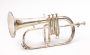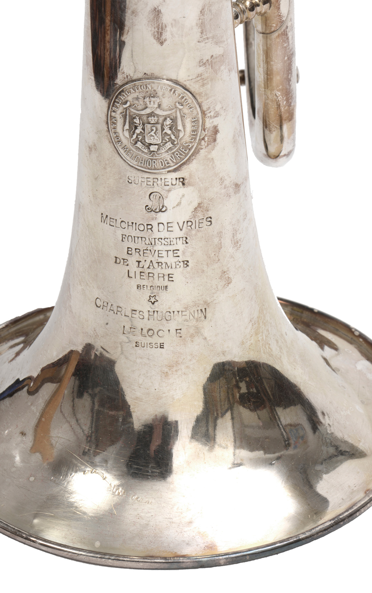 bugle en si b. Fait vers 1950. argenté, marque Charles Huguenin dont il porte la marque sur le pavillon: "Supérieur. Melchior de Vries, fournisseur brevete de l'armée, LIERRE, Belgique. Le Locle, SUISSE. Il porte le numéro 224. Bon état général. Légèrement rayé. avec étui.