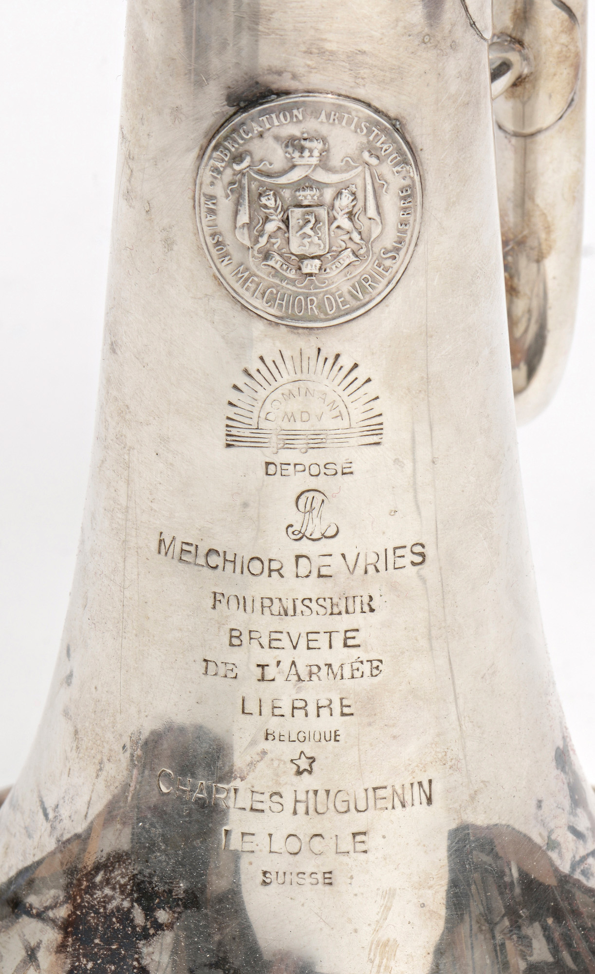 marque Charles Huguenin dont il porte la marque sur le pavillon: "Melchior de Vries, fournisseur brevete de l'armée, LIERRE, Belgique. Le Locle, SUISSE. Il porte le numéro 256., légèrement rayé avec réparation à prévoir à la liaison des pistons avec étui . A restaurer.