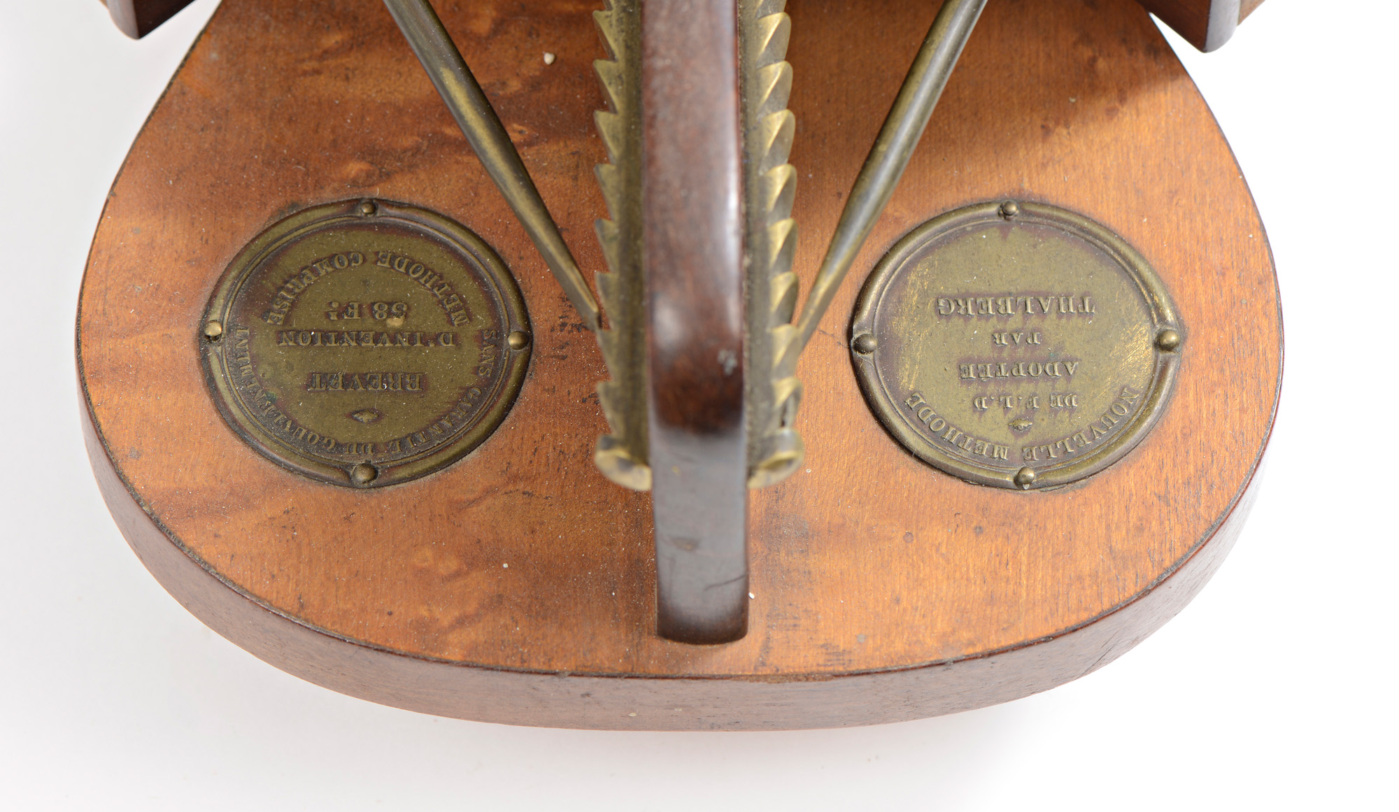 fait vers 1845. Appareil destiné à améliorer la souplesse des doigts, en augmentant leur écartement de façon progressive, selon la méthode de Schubert. Il est composé d'une structure en bois sur laquelle sont fixés deux coussins destinés à maintenir le poignet ainsi qu'un dispositif de volets mobiles venant s'insérer entre les doigts. Deux médaillons gravés: "Sans garantie du gouvernement / Brevet d'invention / 68 F / Methode comprise, Nouvelle Méthode de F.LD. Adoptée par Thalberg. Signé Félix Livacher d'Urclé.