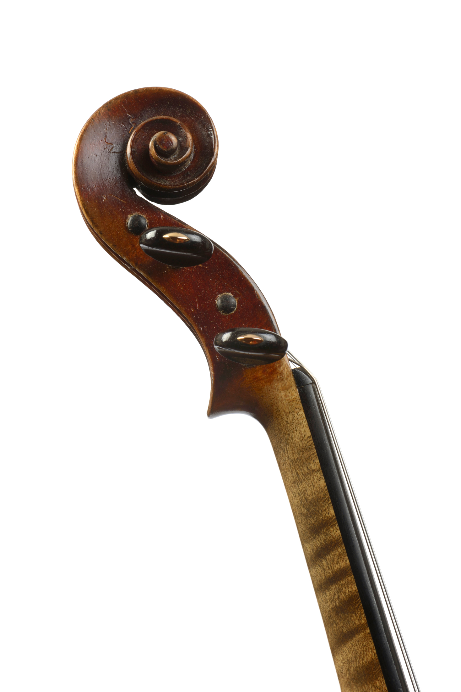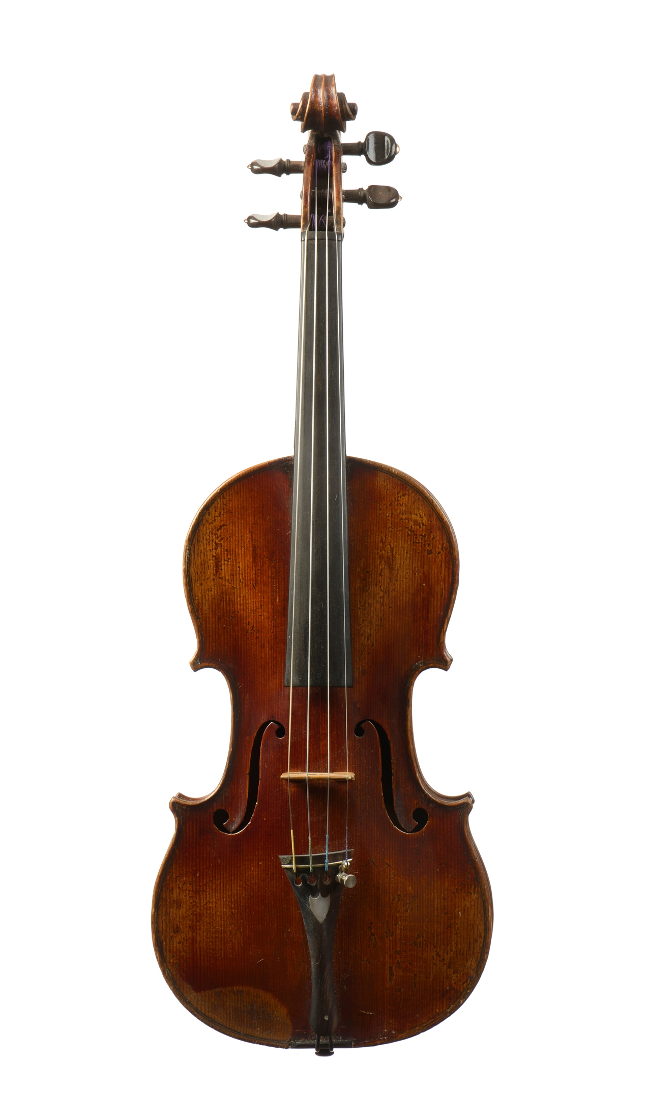 Interessant Violon fait à Mirecourt par Honoré Derazey Père, dont il porte la marque au fer à l'intérieur. Fond d'une pièce en bel érable aux ondes moyennes et régulières descendantes sur la gauche. Eclisses et tête du même bois. Table en épicéa aux pores réguliers. Vernis brun rouge sur fond doré. 360 mm. En bon état de restauration. Prêt à jouer. Avec sa boite d'origine, et une documentation sur l'instrument.