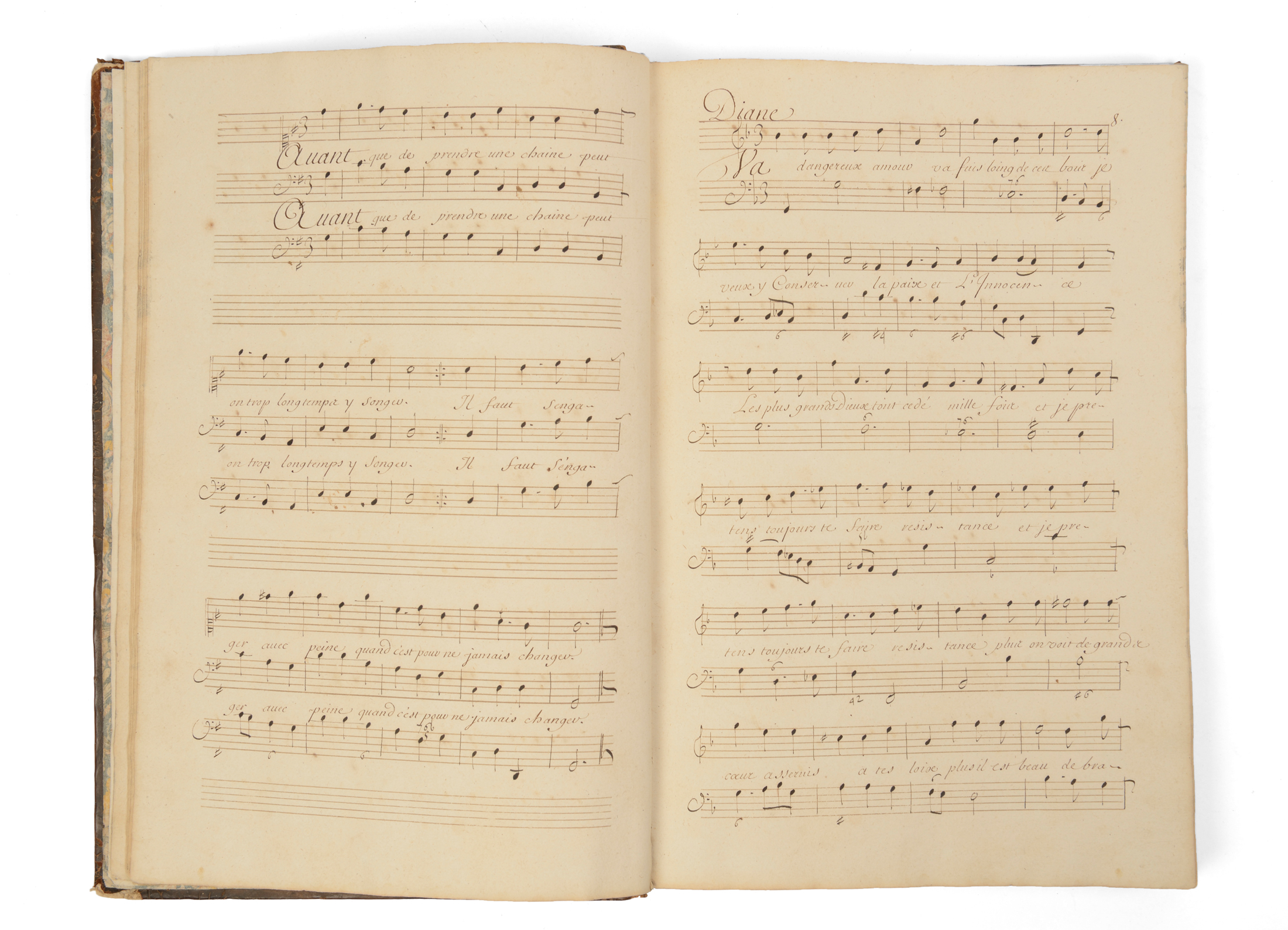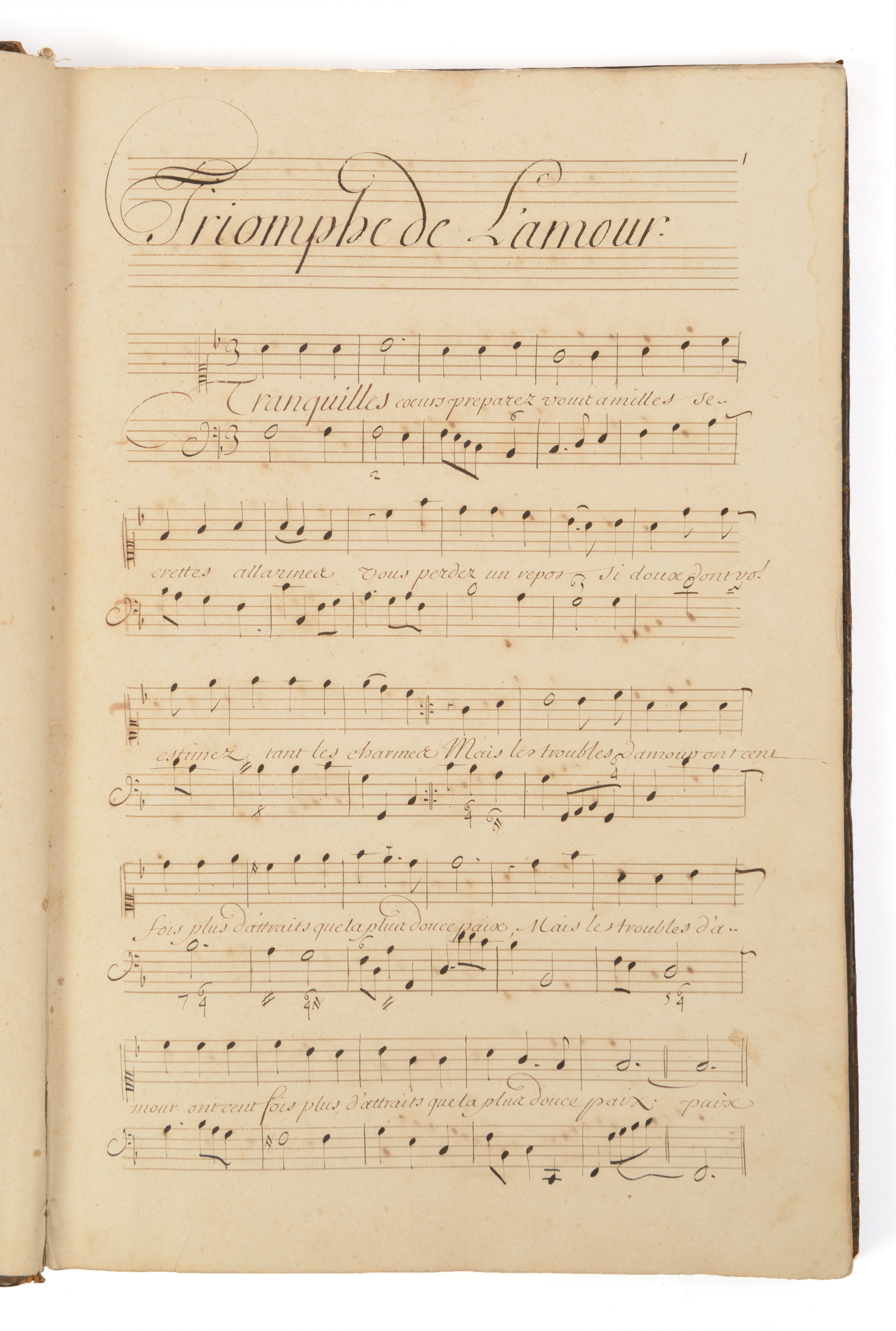 Rare volume en manuscrit d'époque, réalisé sous les auspices du marchand de musique Foucault et des copistes qu'il employait, des airs les plus marquants de certains opéras de Lully, en particulier pour ce second tome dont seule la page de titre est imprimée : le Triomphe de l'Amour, Persée, Phaéton, Amadis, le Temple de la Paix, Roland, Armide, Acis et Galatée. La reliure est aussi d'époque mais a subi les affres du temps : dos très abimé (seule la moitié basse subsiste), coins émoussés; en revanche l'intérieur est très propre, et la copie manuscrite de haute qualité. Bel ex-libris gravé non identifié, ex-dono manuscrit "Madame Durafour Avennes". Il figure un Ex-libris aux armes de la famille d'Aligre , ainsi qu'une inscription manuscrite en haut de la page : "Madame de la Tour intendante à Rennes (épouse de Jean-Baptiste des Gallois de la Tour , intendant de Bretagne de 1728 à 1735 )