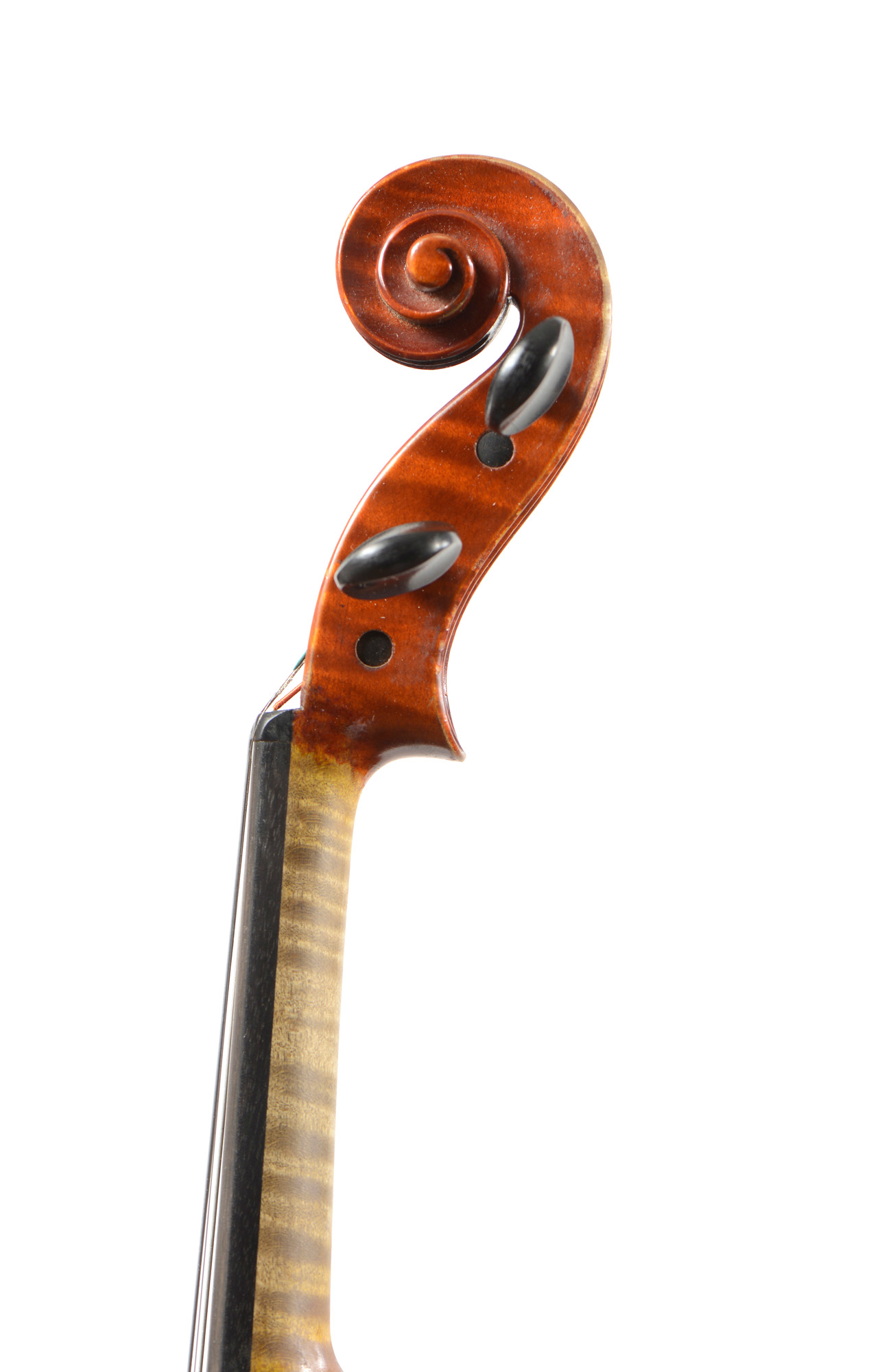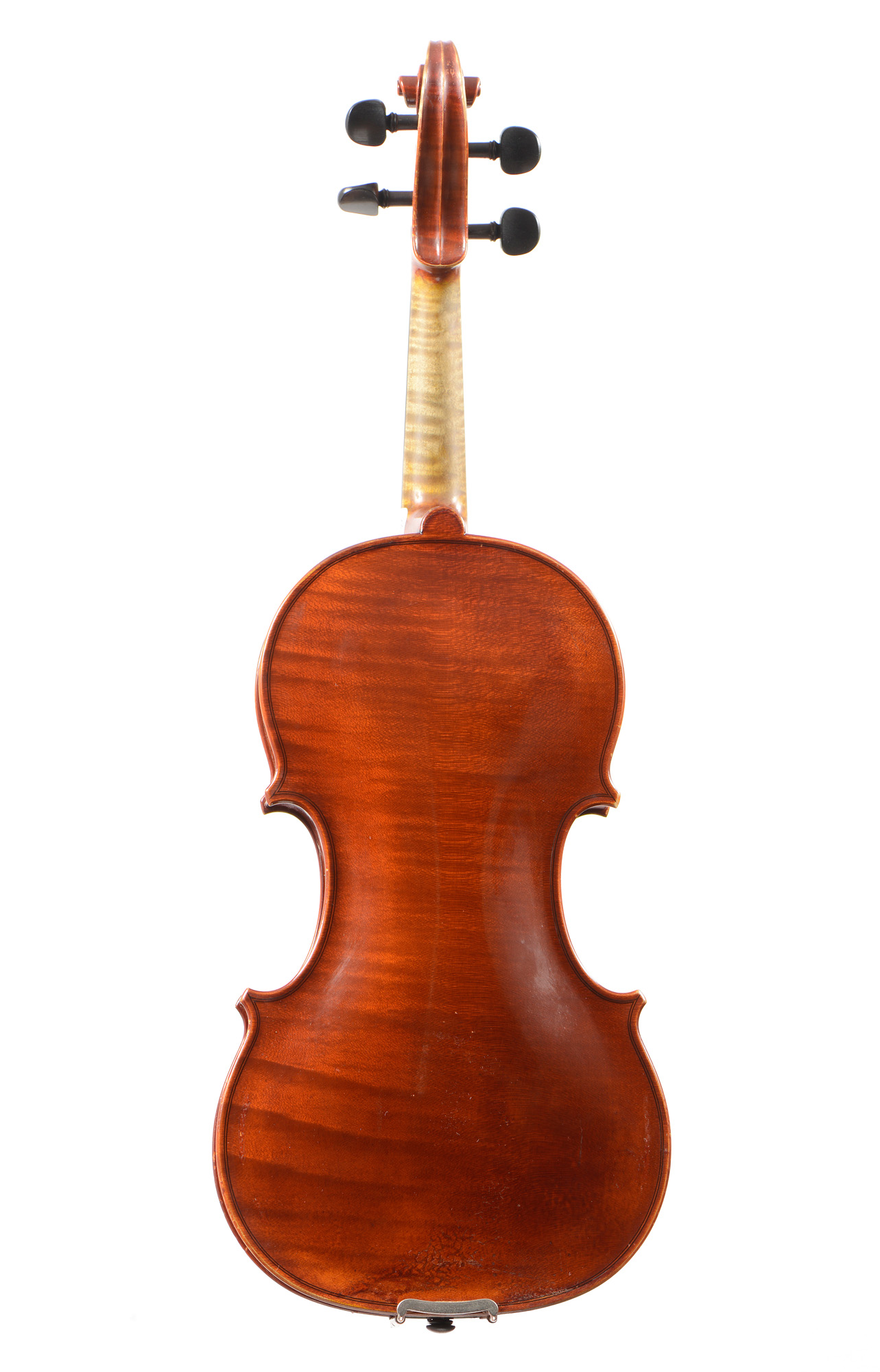 dont il porte l'étiquette originale de René Garmy, daté de 2007. Fond d'une pièce en bel érable. Eclisse et tête du même bois. Table de deux pièces en épicéa aux pores très serrés et réguliers. Vernis brun rouge sur fond doré. 357 mm. Avec boite et archet Ary France.