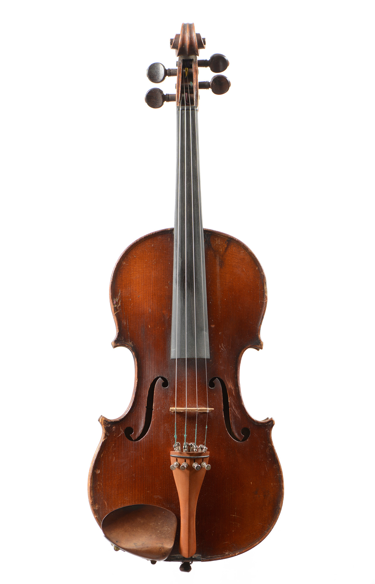 portant l'étiquette de Marc Laberte à Mirecourt et le numéro 1439, ainsi qu'une étiquette copie de Stradivarius 1721. Vernis à revoir. Fond d'une pièce en érable. Eclisses et tête du même bois. Quelques griffures sur les éclisses. Petite cassure au talon. 359 mm.