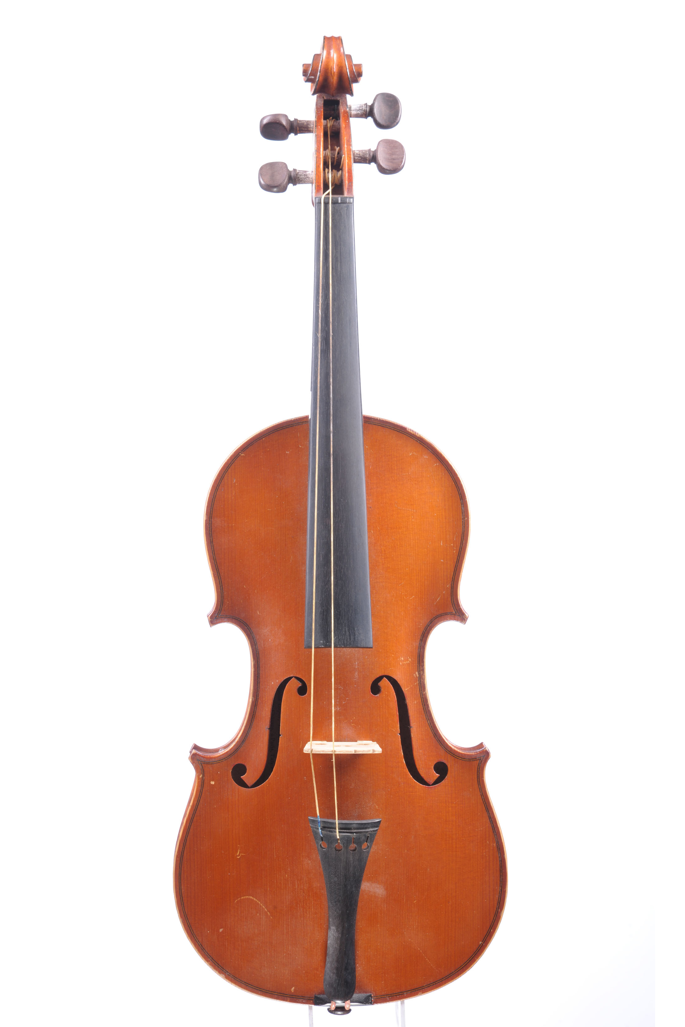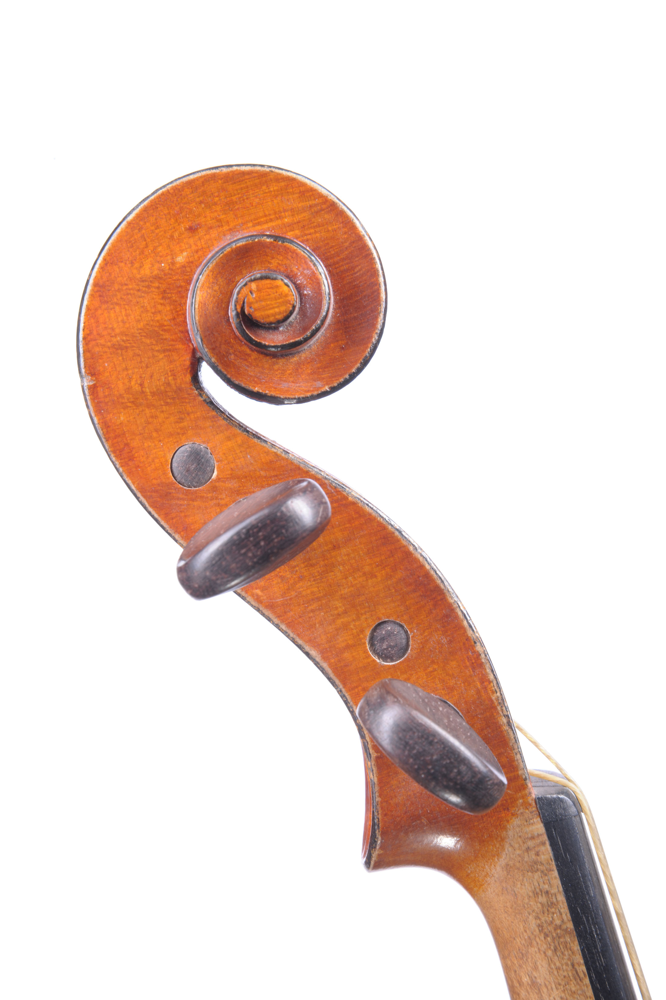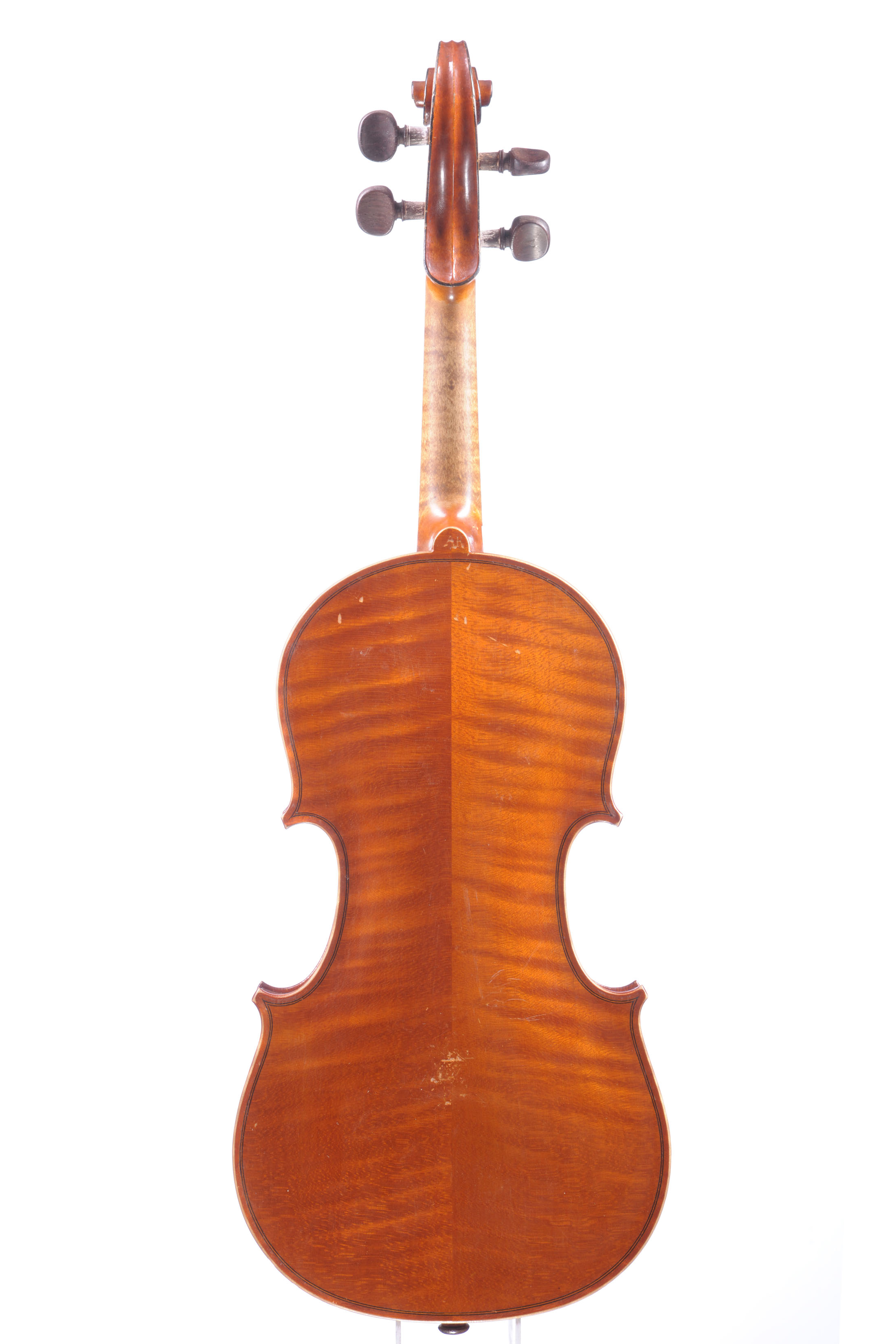 fait en copie de Nicolas Lupot de 1824 dont il porte l'étiquette. Fond de deux pièces en bel érable, aux ondes larges descendantes sur les bords. Table de deux pièces aux pores plutôt larges et réguliers. 359 mm.