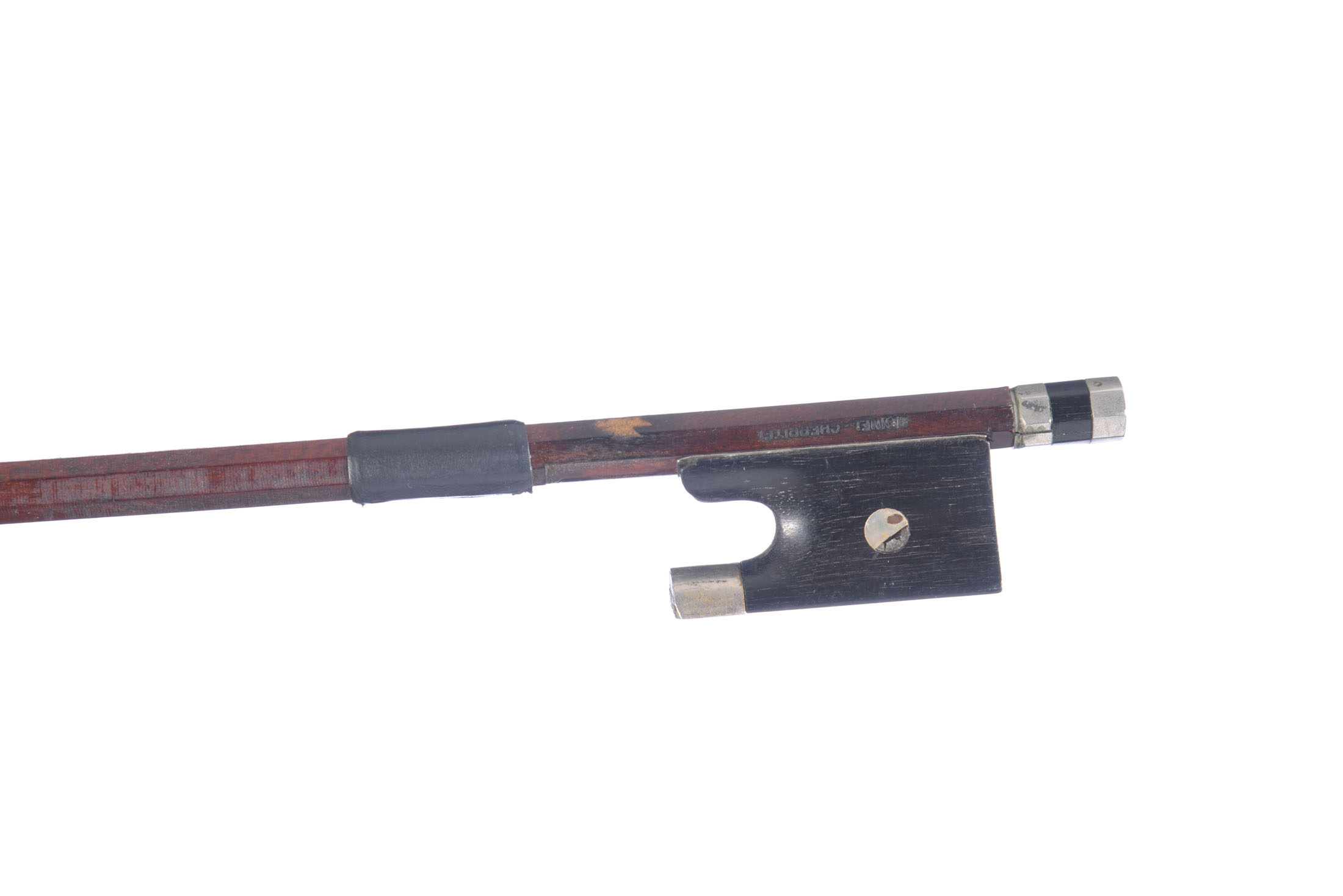fait à Mirecourt, portant une marque au fer apocryphe de Moinel Cherpitel. Belle baguette en beau bois de pernambouc. hausse ébène monté maillechort, avec grain. 729 mm. 58,2 g. Sans mèche, ni garniture.