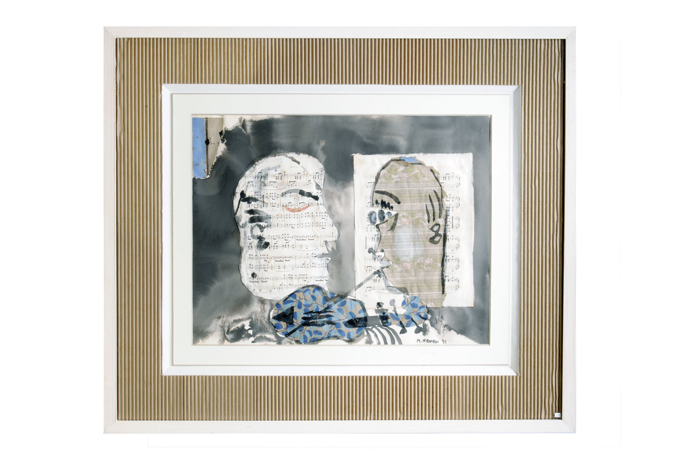 Encre et collages de partitions sur papier, représentant deux portraits de violonistes. 50 x 65 cm. Signé en bas à droite M.Neveu 91.