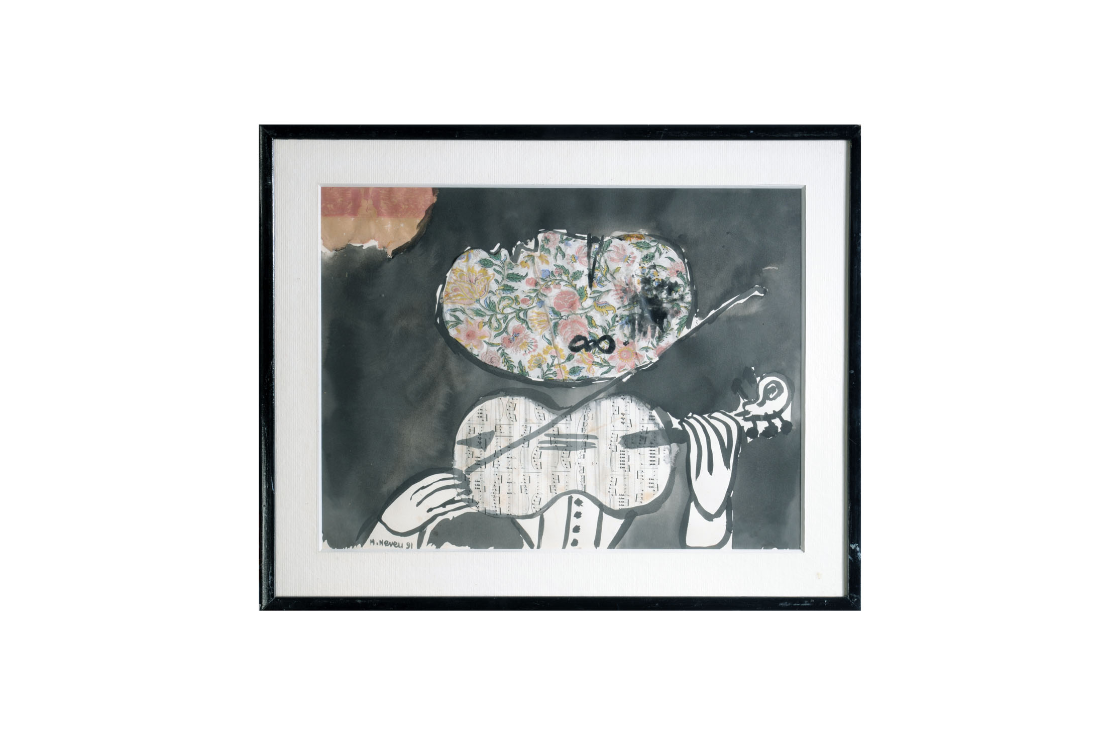 Collage de partitions et ensemble floral, encre, représentant un violoniste. 58 x 62 cm. Signé en bas à gauche dans l'ensemble "M.NEVEU 91".