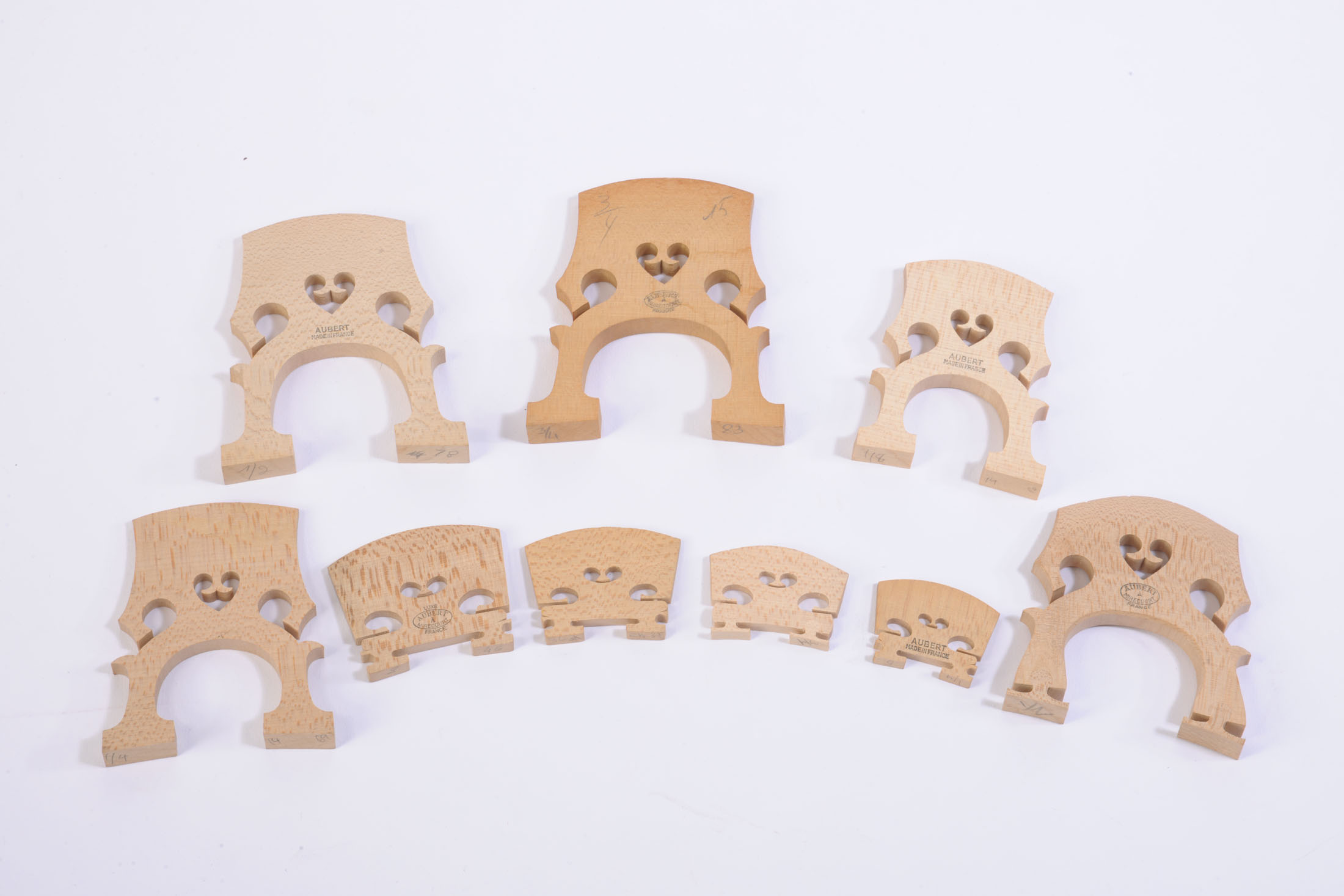 1 chevalet Français pour violoncelle 3/4. 4 chevalets Français pour violoncelle 1/2. 4 chevalets Français pour violoncelle 1/2. 5 chevalets Français pour violoncelle 1/8. 15 chevalets pour violon 3/4. 8 chevalets pour violon 1/2. 12 chevalets pour violon 3/4. 22 chevalets pour alto.