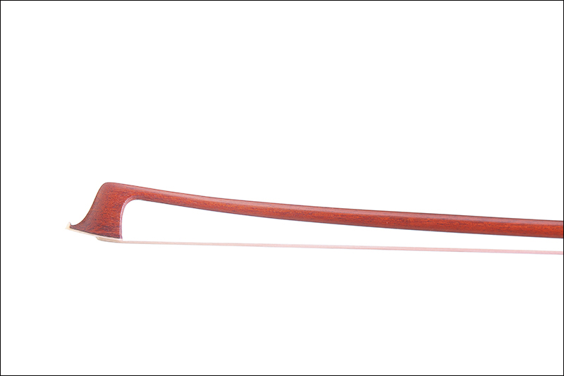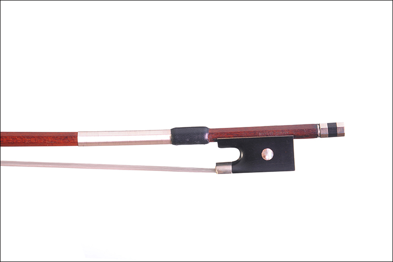 Archet de violon fait par Louis Bazin, dont il porte la marque au fer. Baguette ronde en pernambouc. Hausse ébène montée maillechort. 731 mm, 59,3 g.