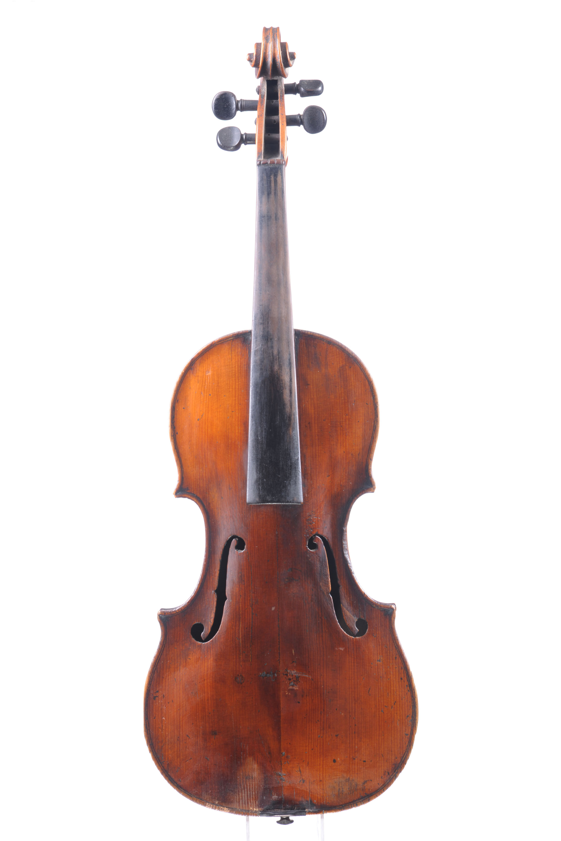 fait vers 1830 avec son manche d'origine. Fond d'une pièce. Vernis brun foncé sur fond doré. 367 mm. Accident à un f, réparé et cassure de table à la barre réparée.