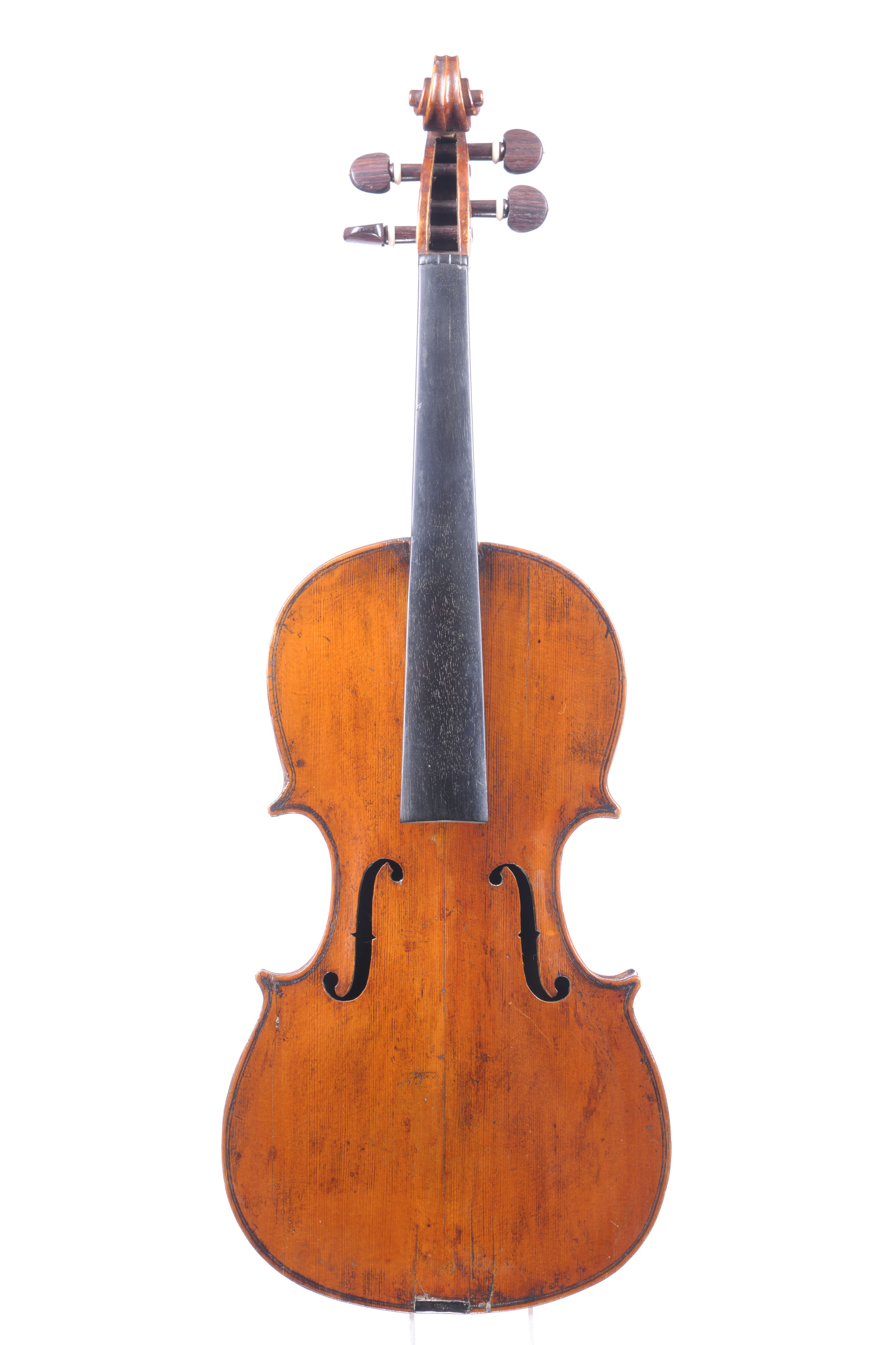 Violon d'amateur fait au début du XIXeme. Diverses cassures recollées sur sa table. Le vernis est retouché. Anonyme. 365 mm. Manche d'un autre auteur.