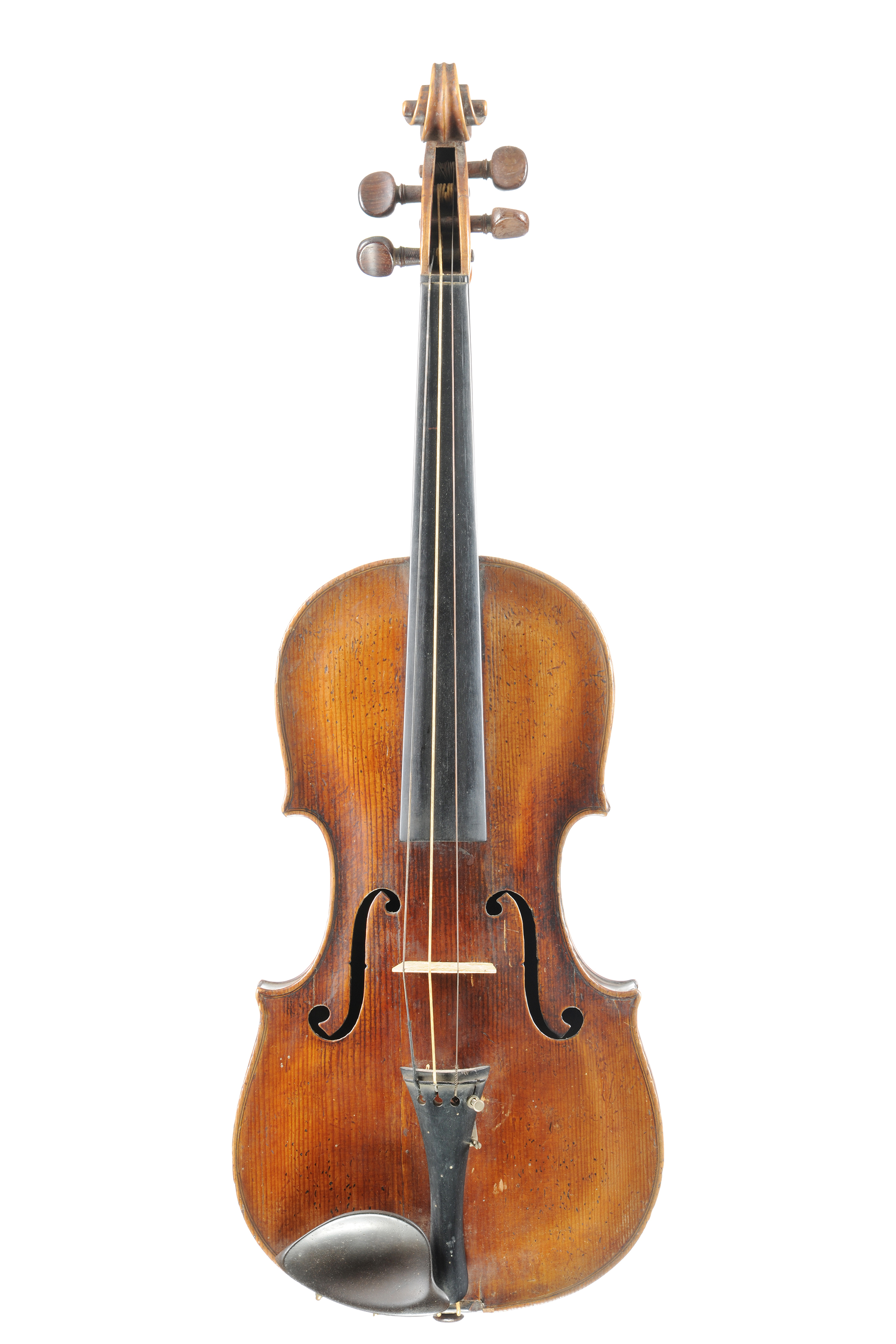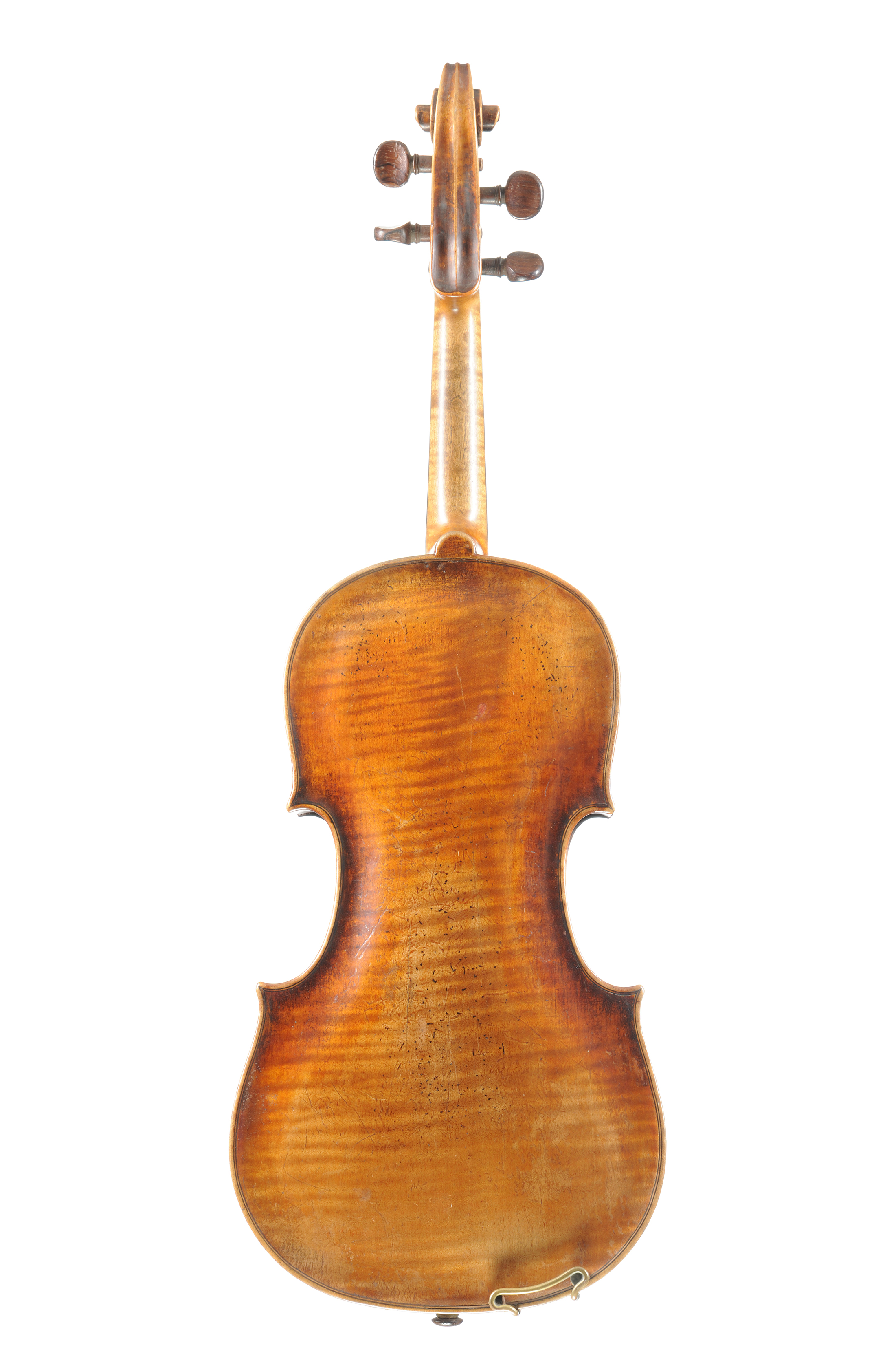 Violon Allemand, début XIXe. Atelier Hopf. Cassure de table. Fond d'une pièce, vernis brun sur fond doré. En l'état. 360 mm.