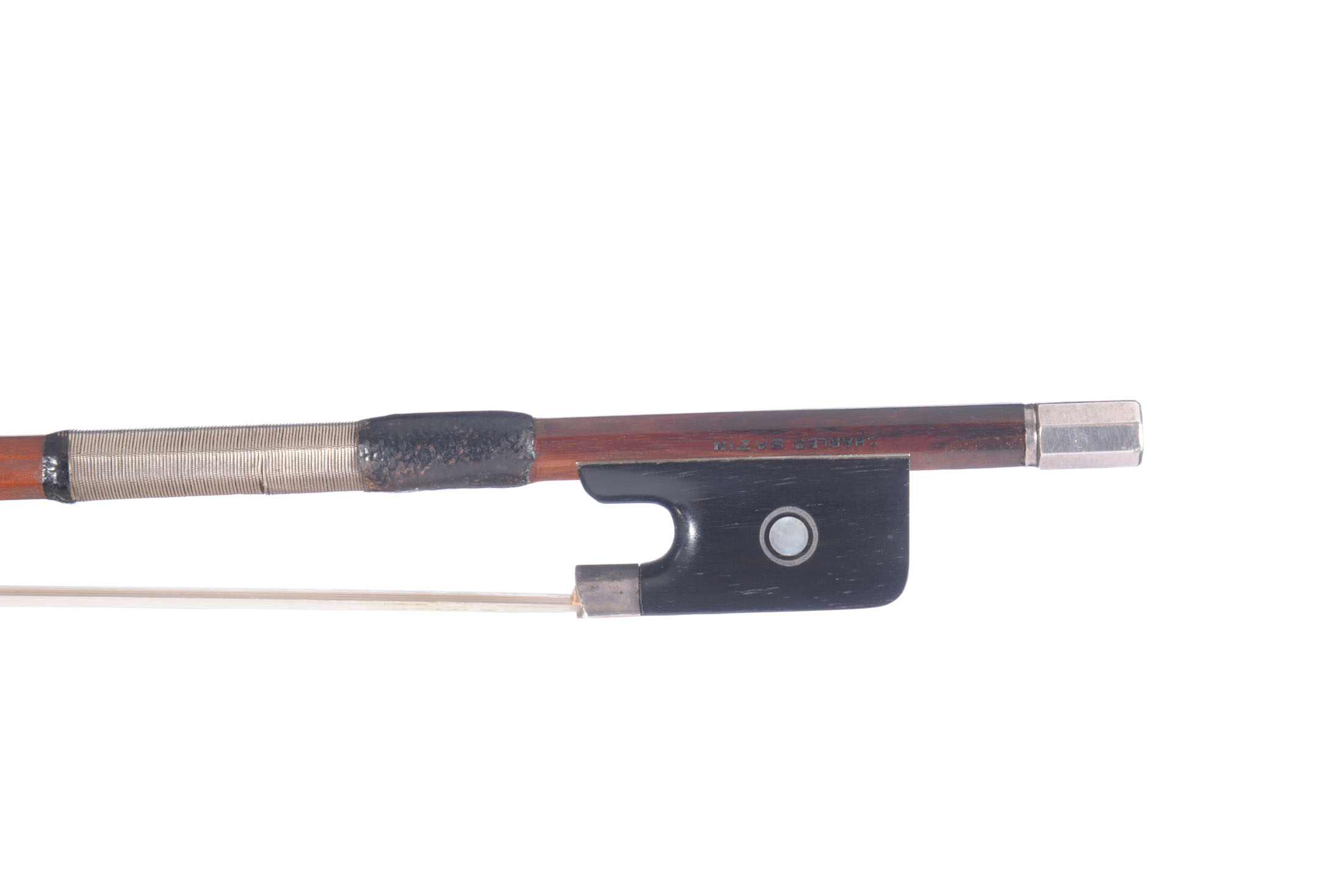 marque au fer de Charles Bazin, Baguette ronde en pernambouc. Hausse ébène a talon rond, montée argent. Grain parisien. 59,3 g. 728 mm.