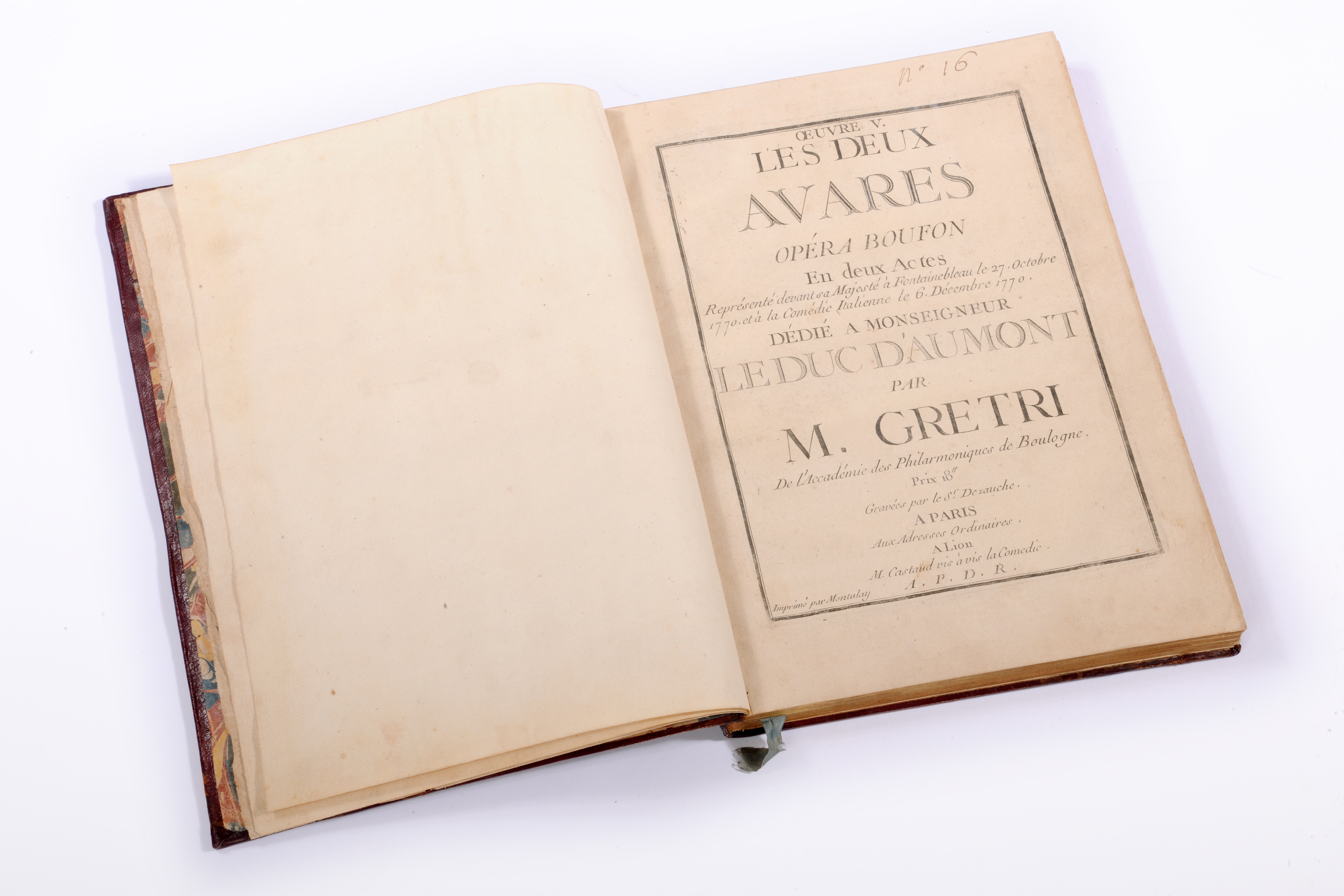 * Les Deux Avares, Opéra-bouffon en deux actes, Op. 5. Paris, Adresses ordinaires, Lyon, Castaud [1771], in-folio, plein vélin vert, 155 pp. Un des premiers tirages (« Imprimé par Montulay »), belle gravure musicale de Dezauche. Bel exemplaire en reliure d'époque, étiquette de titre en maroquin au premier plat.