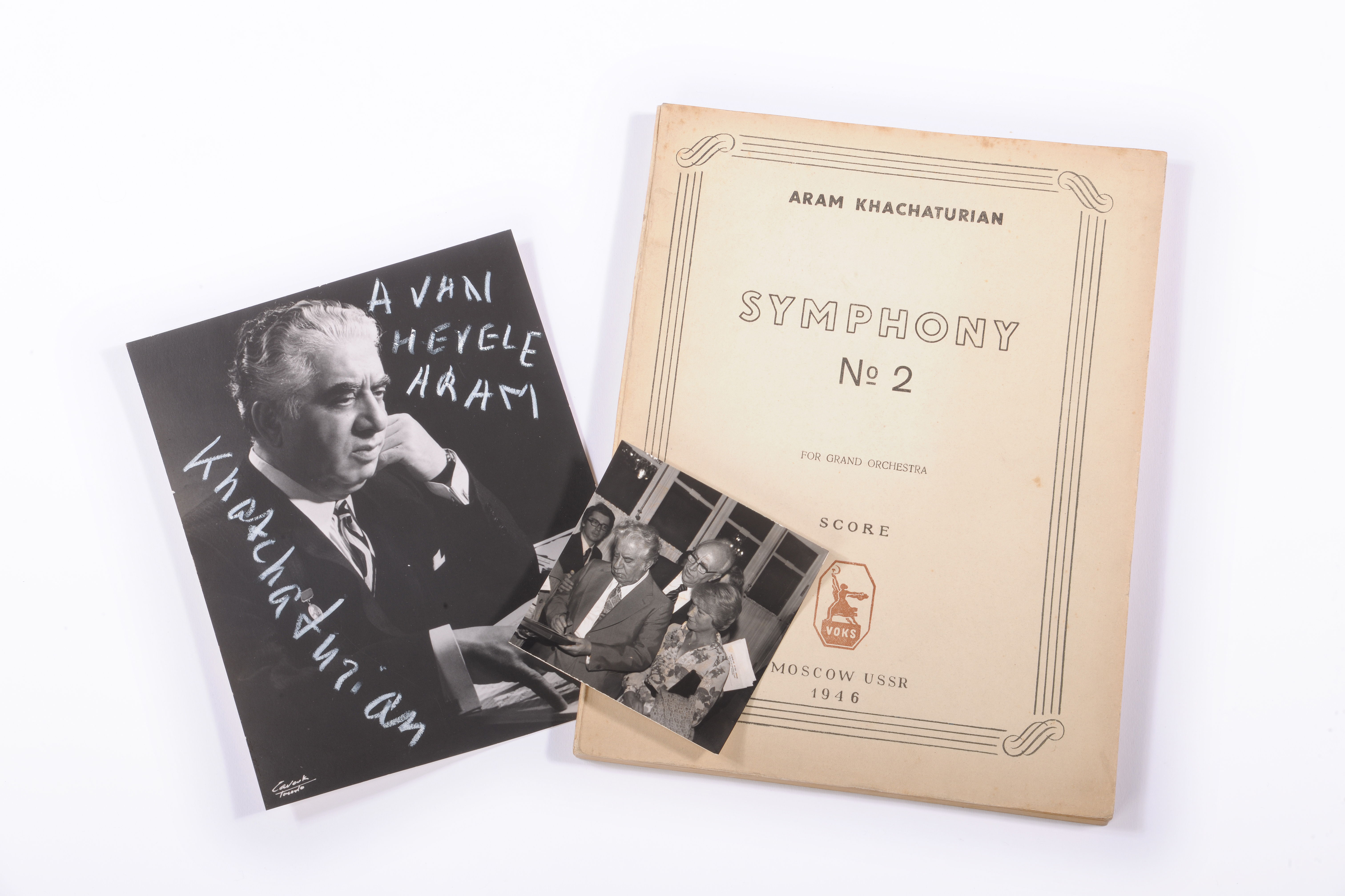 Édition originale de la partition d’orchestre de cette importante symphonie composée pendant la seconde guerre mondiale. Le volume est accompagné d’une photo originale, portrait très réussi du généreux compositeur, qui a « improvisé » un envoi autographe signé en capitales au crayon blanc autour de son portrait : « A Van Hevele, Aram Katchatourian » (tirage argentique de 1977, Bruxelles, Astoria, 17,5 x 22 cm). On joint une photo de presse (Cachet Sound Press International, 10 x 10,5) présentant le compositeur en pleine séance de signature, toujours à l’Hôtel Astoria de Bruxelles en juin 1977. Très belle réunion en excellent état.