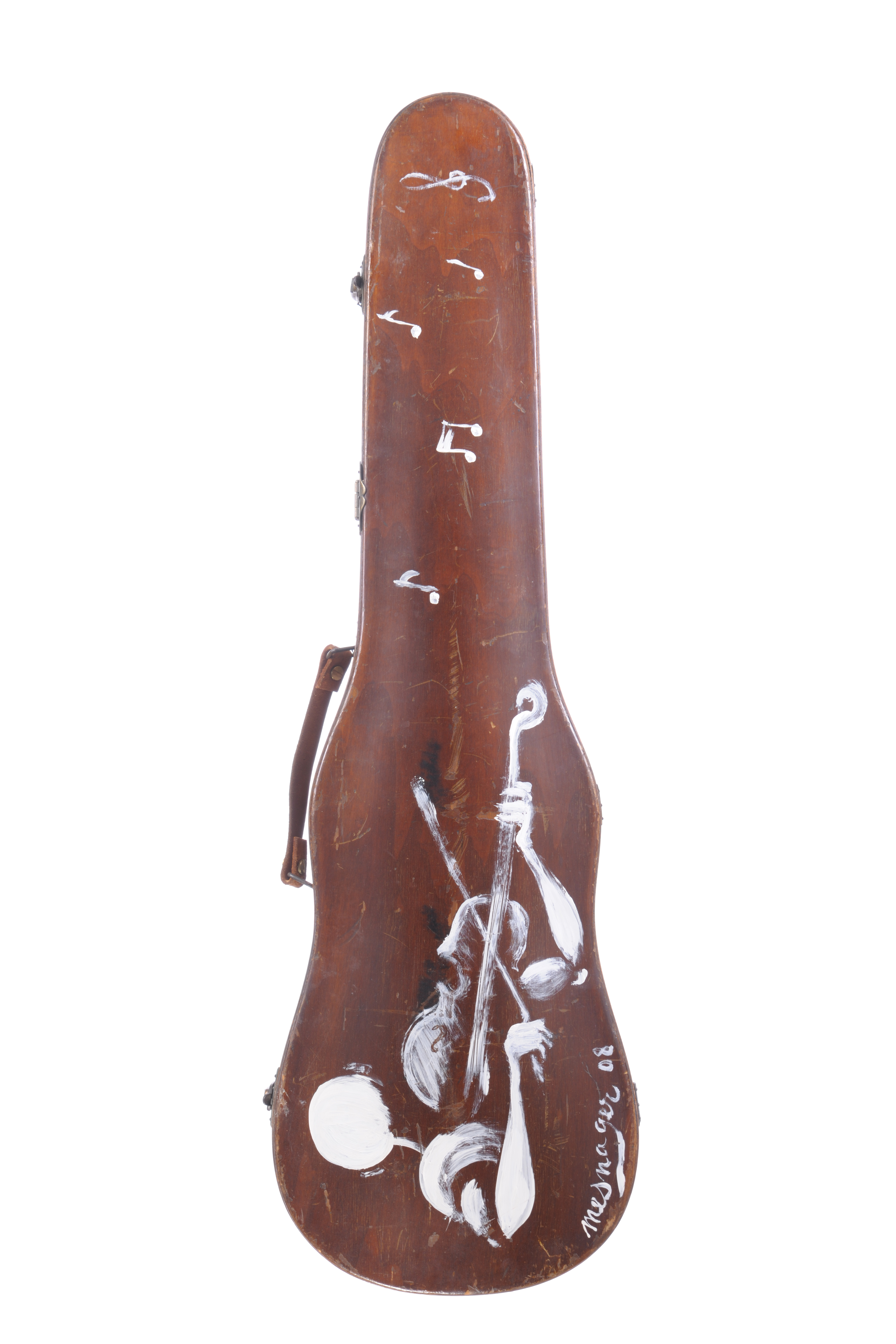Etui de violon, en forme cathédrale, fin XIXe intérieur velours, peint à l'acrylique par Jérôme Mesnager en 2008, représentant un violoniste.
