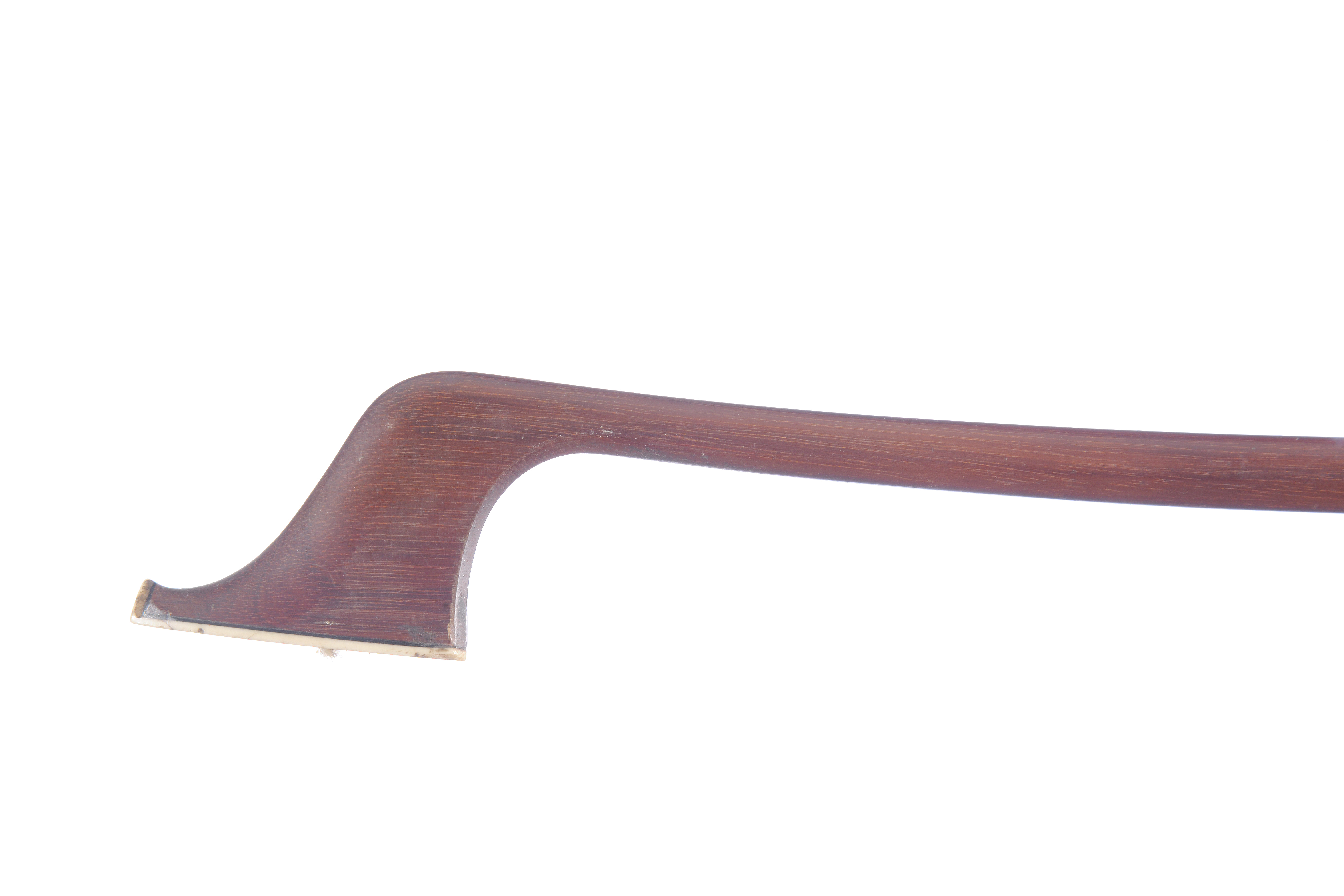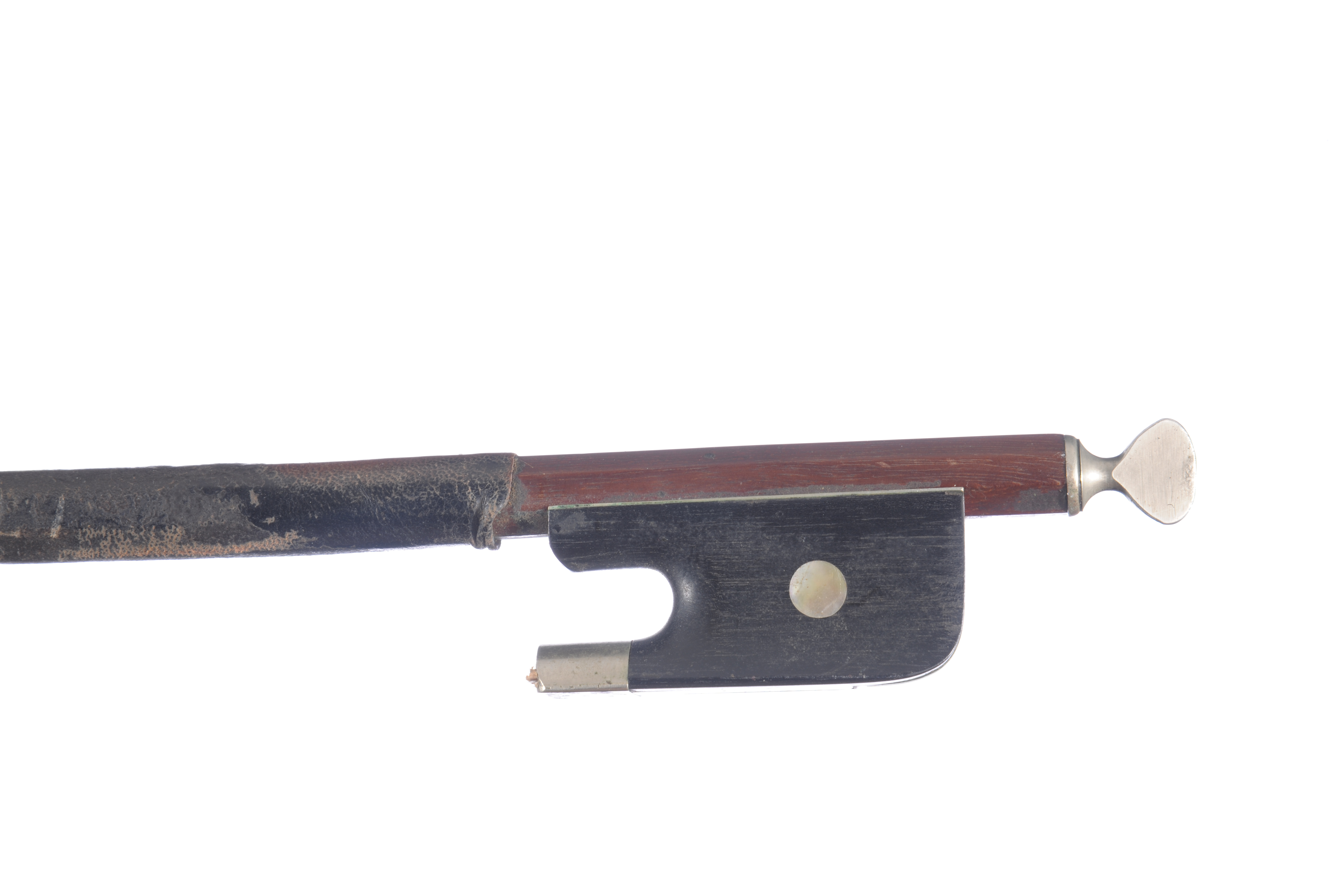 Archet de contrebasse 3/4 fait à Mirecourt. Hausse ébène avec grains, montée maillechort. Bouton papillon. 603,5 mm sans mèche garniture cuir.