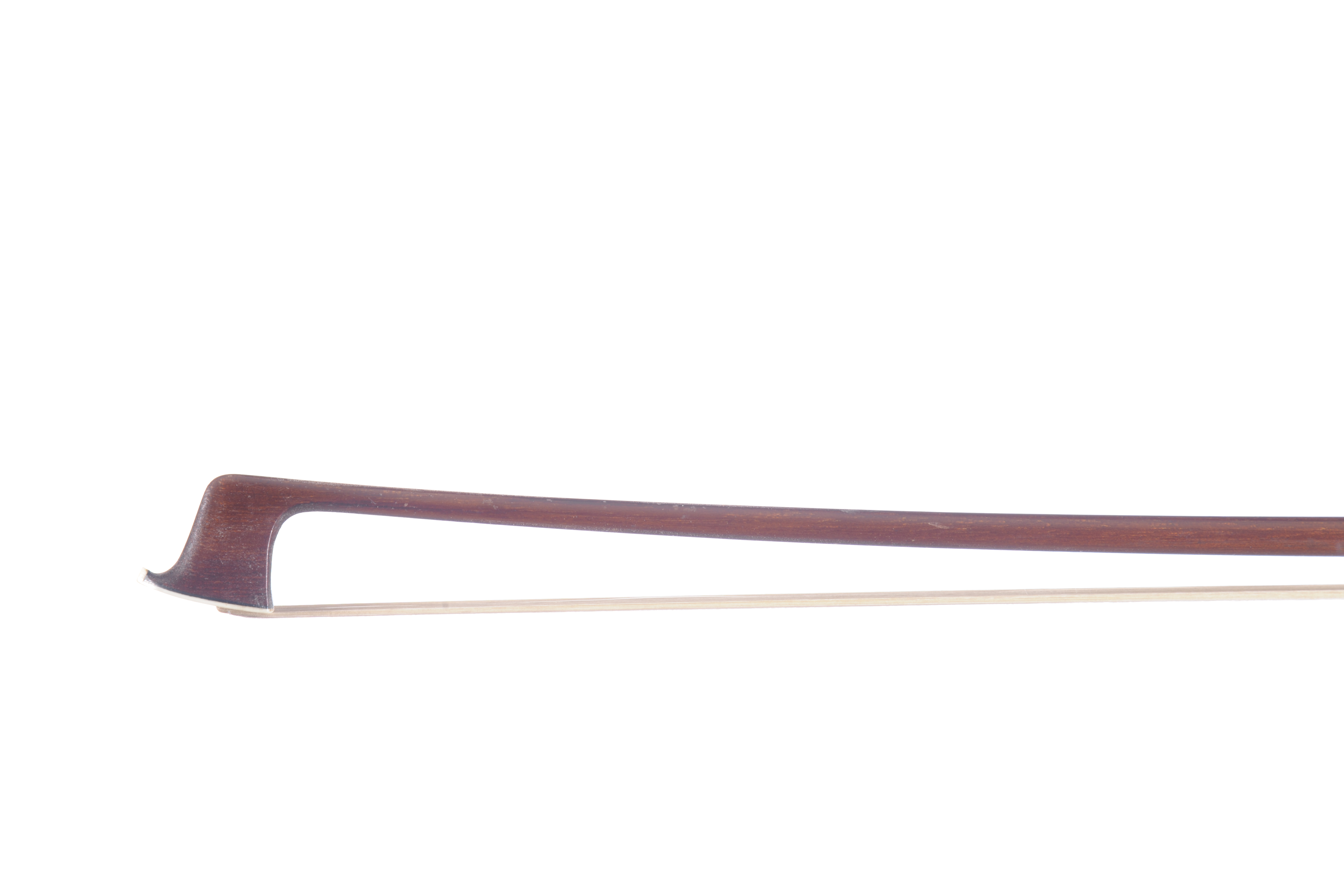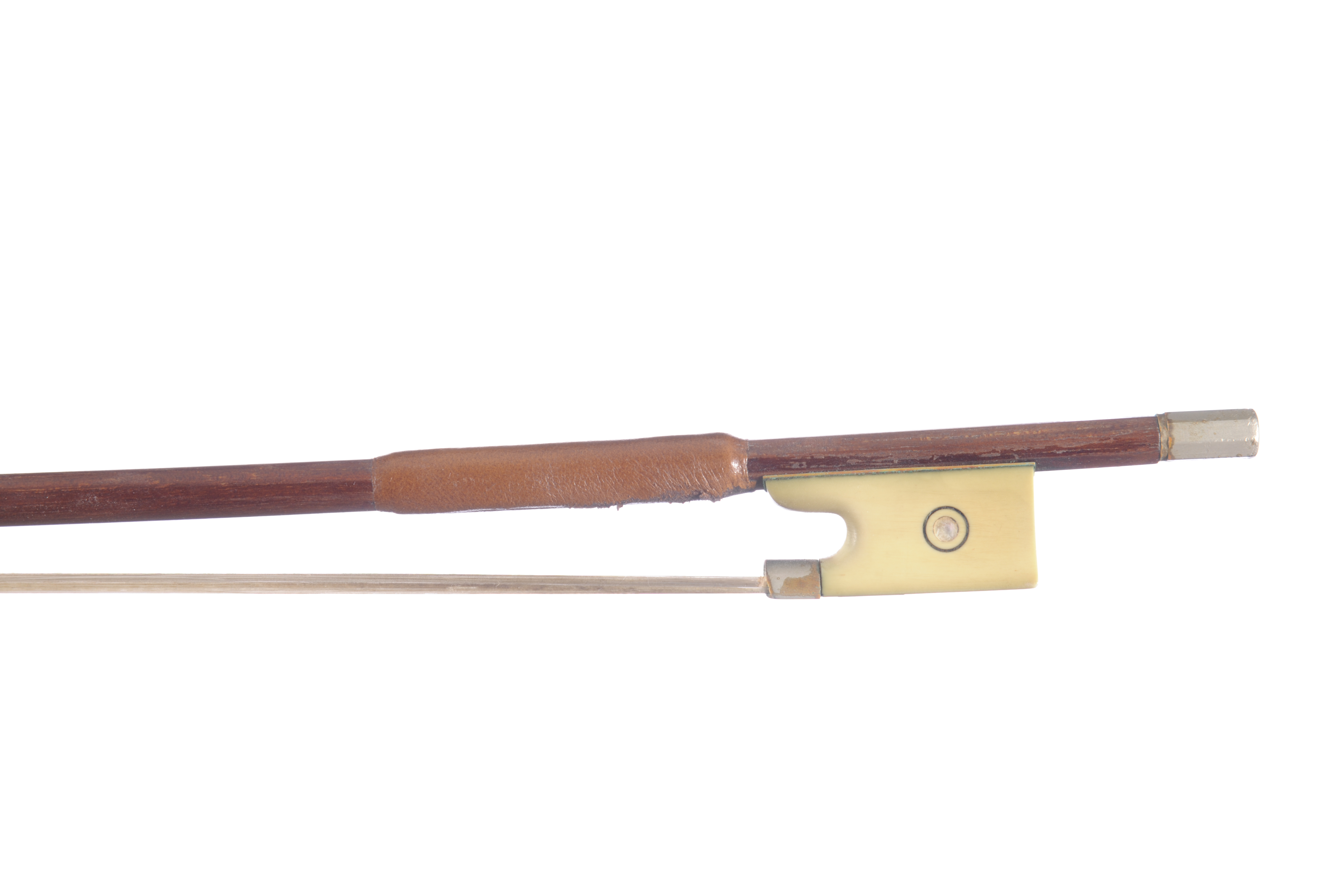 Archet Allemand en bois d'abeille. Hausse en ivoirine montée maillechort avec grain cerclé, 728 mm, 61g.