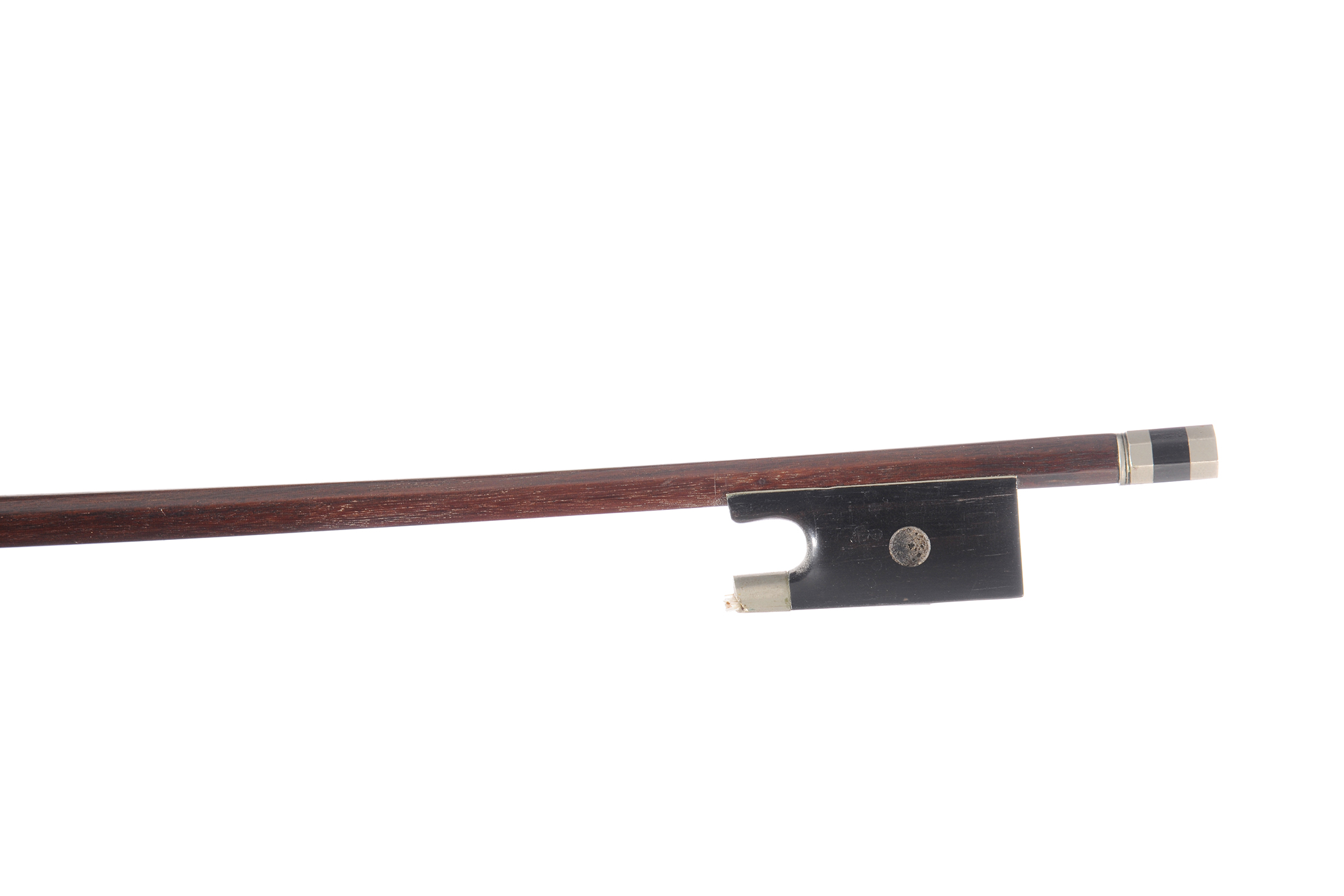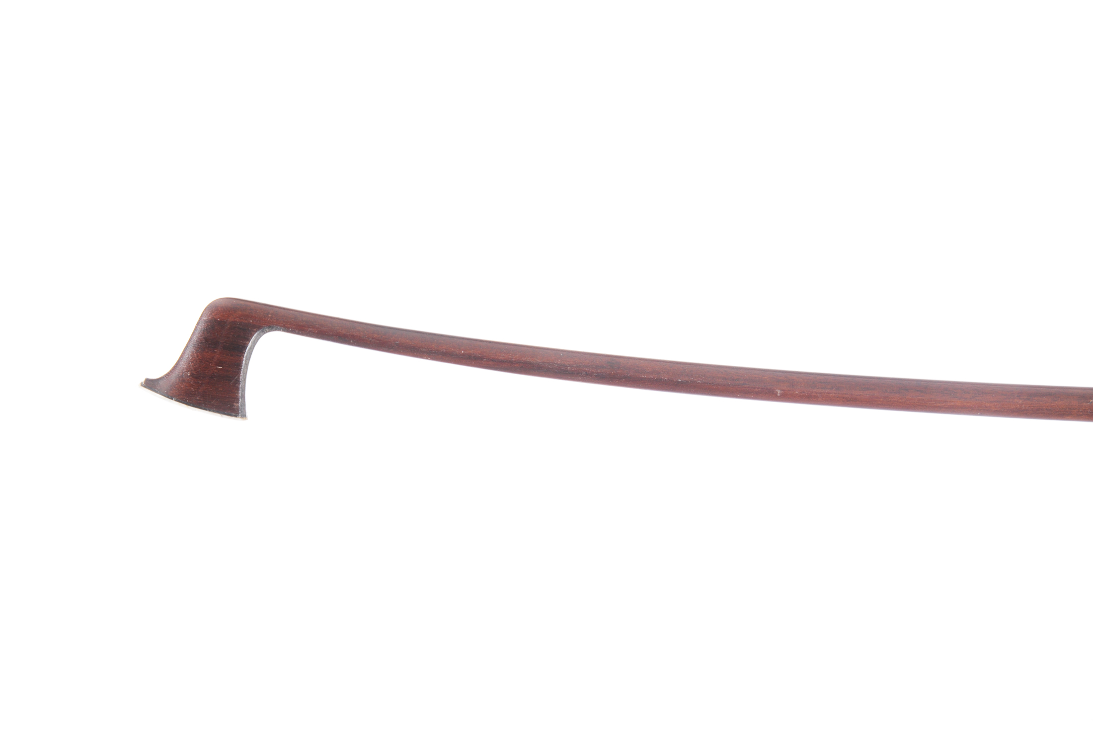 Archet de violon. Baguette en pernambouc. Atelier de Barjonnet. Hausse ébène, avec grains (manquants) montée maillechort, 48g sans mèche ni garniture, 728 mm.