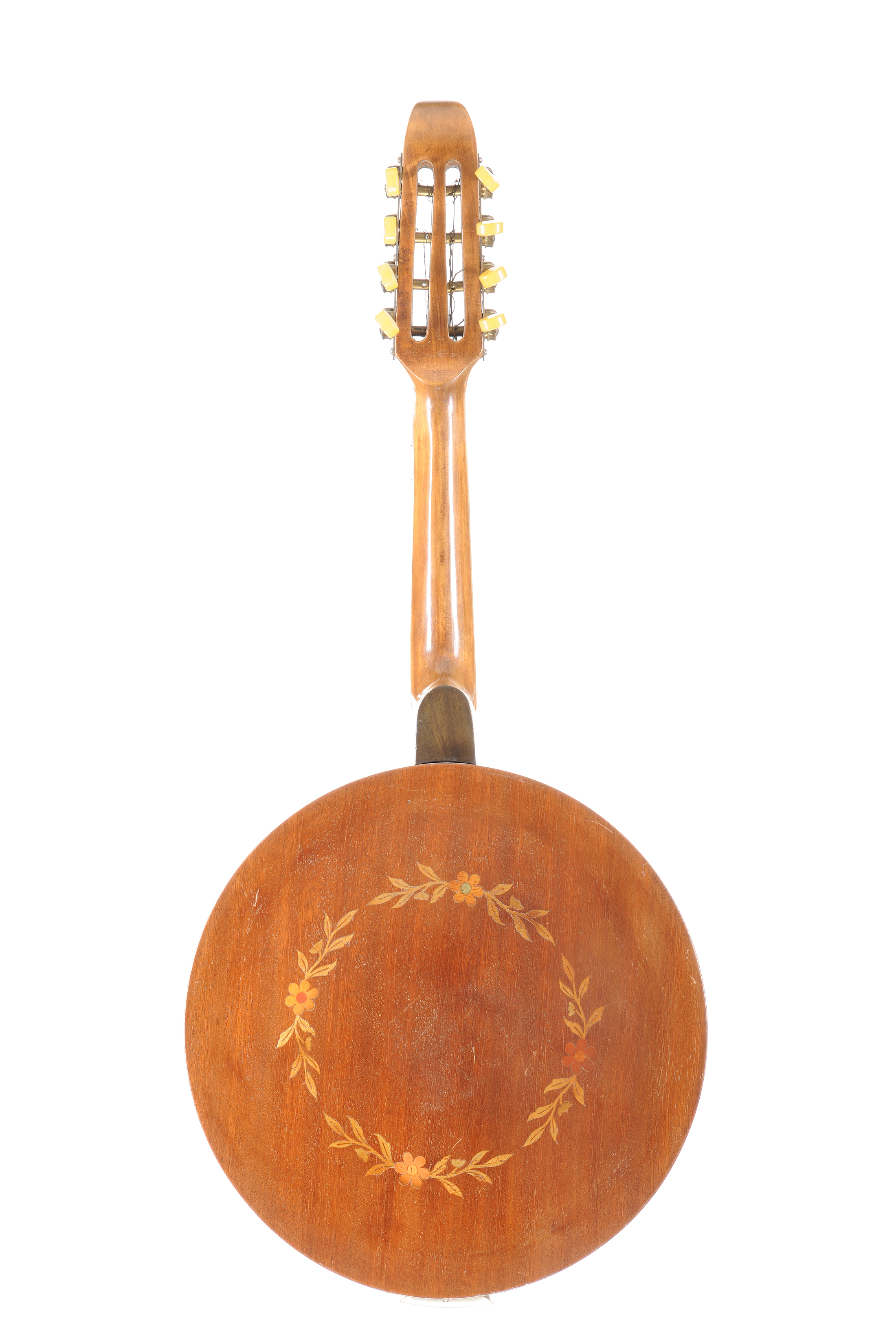 Banjo années 30. Dans sa boite. En l'état. Fond marqueté d'un décor floral.
