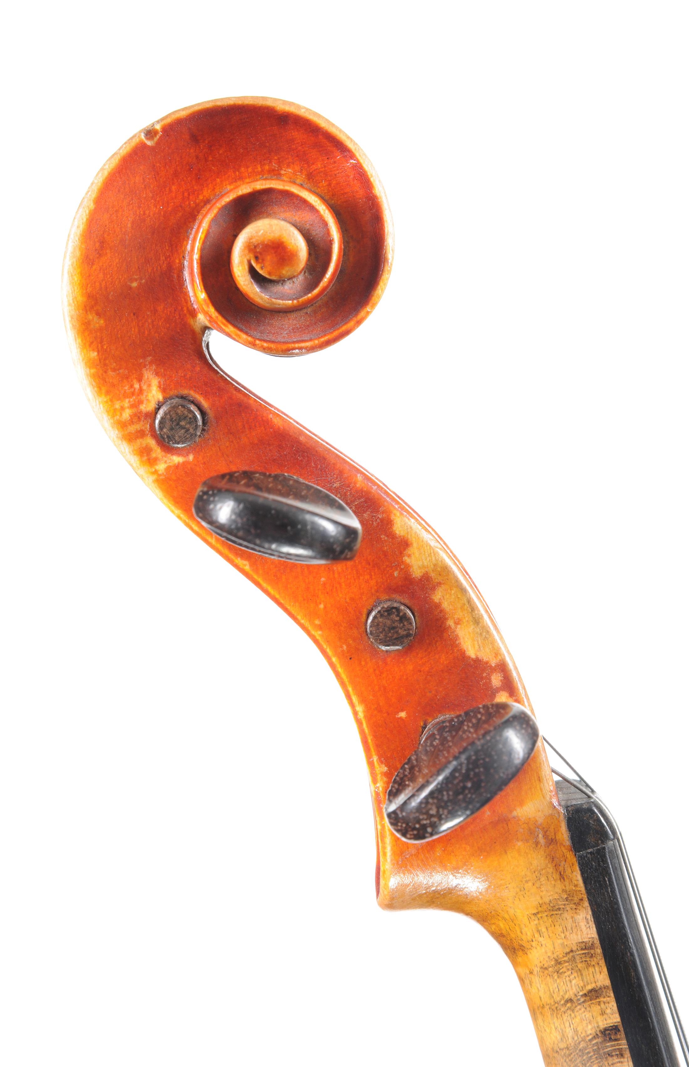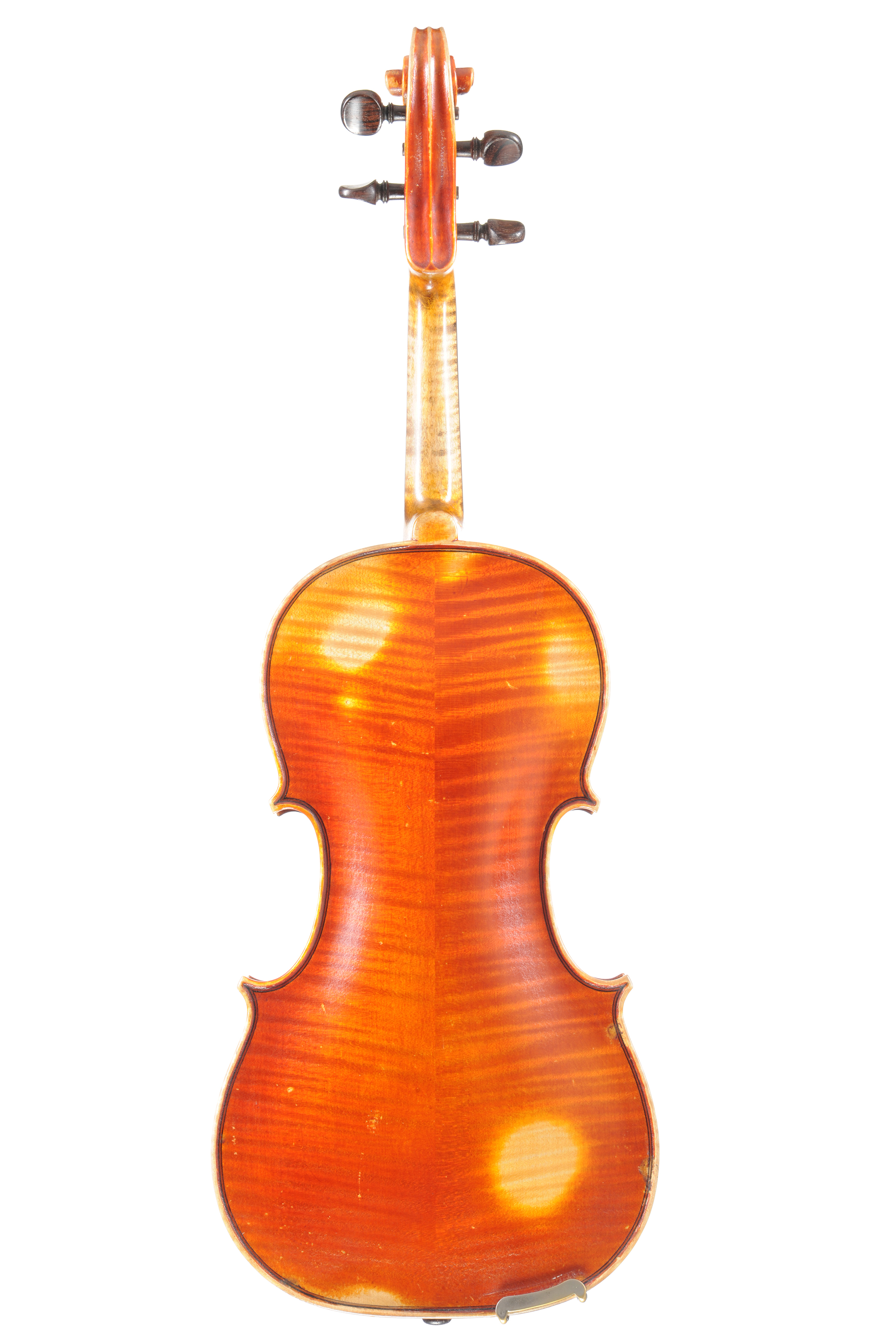 Violon Français, portant une étiquette de Maurice Rougier à Toulon. 1949. N°91. 360 mm. Fond de deux pièces en érable flammé, vernis orangé rouge sur fond doré. Petite cassure de table. Avec boite.