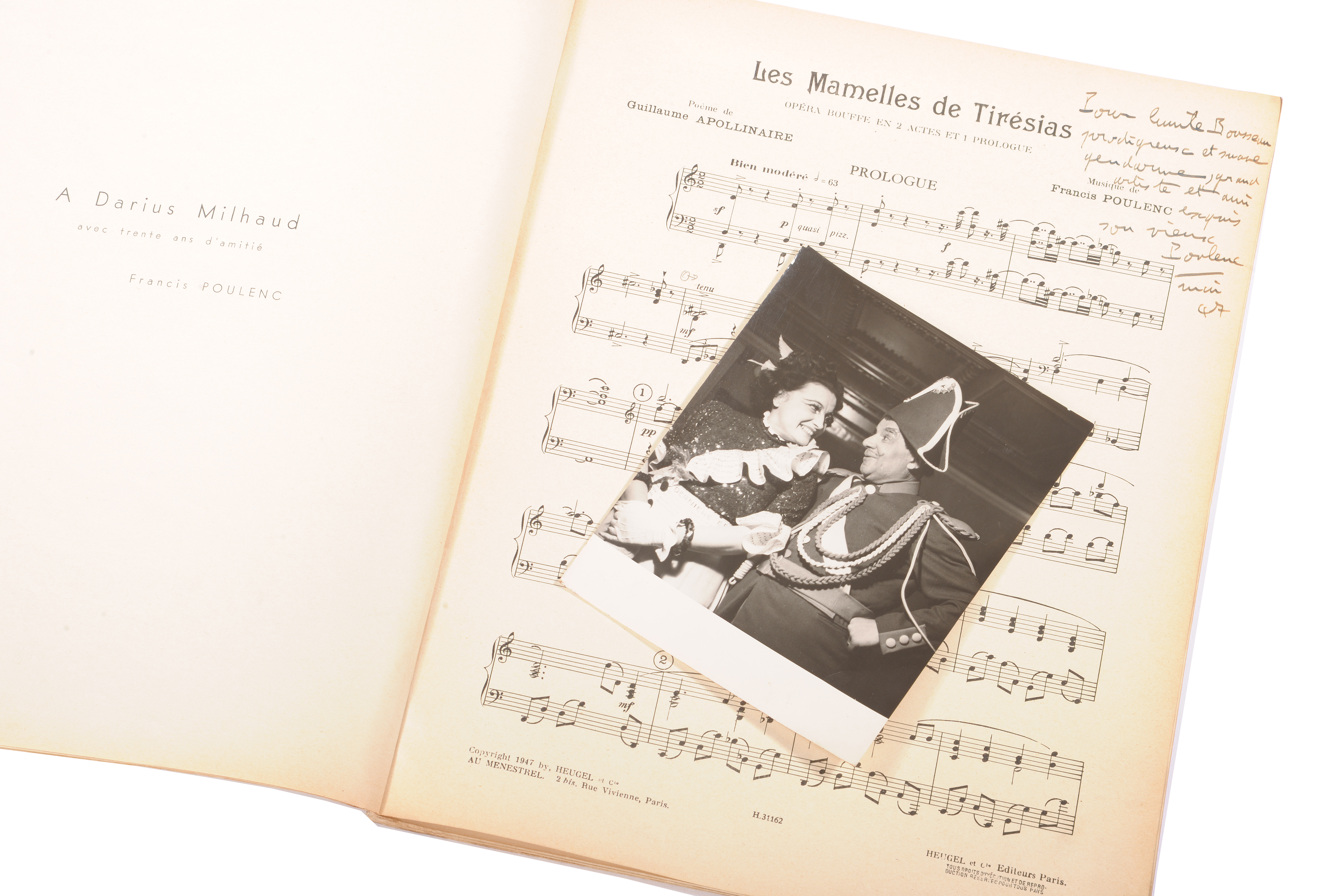 Édition originale de la partition chant et piano réduite par l’auteur, sur un poème de Guillaume Apollinaire. Superbe couverture illustrée en couleurs par Erté. Exemplaire du créateur du rôle du Gendarme, orné d’un très bel envoi autographe du compositeur : « Pour Émile Rousseau, prodigieux et suave gendarme, grand artiste et ami exquis, son vieux Poulenc, mai 1947 ». Est conservée dans l’exemplaire un tirage photographique (Lipnitzki) du portrait de Rousseau en costume de Gendarme des Mamelles. On rappelle les mots de Poulenc concernant la mise en scène, reproduite en introduction de la partition : « Je désire que les costumes soient de l’époque 1910. Le décor devra représenter une ville imaginaire de la Riviera française, quelque part entre Monte-Carlo et Nice. Sous aucun prétexte la mise en scène ne devra être exotique ». Couverture légèrement salie sinon très bel exemplaire.