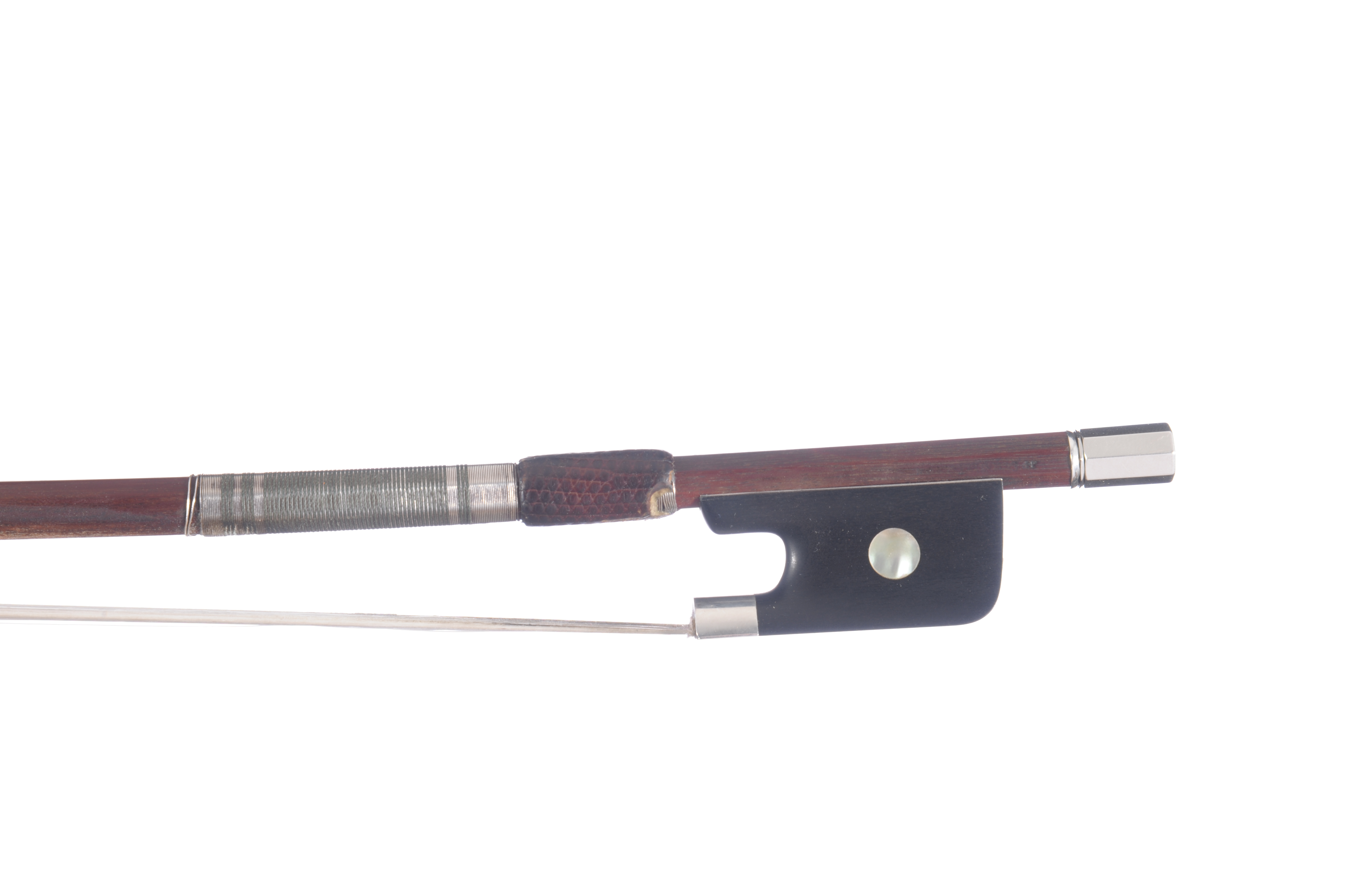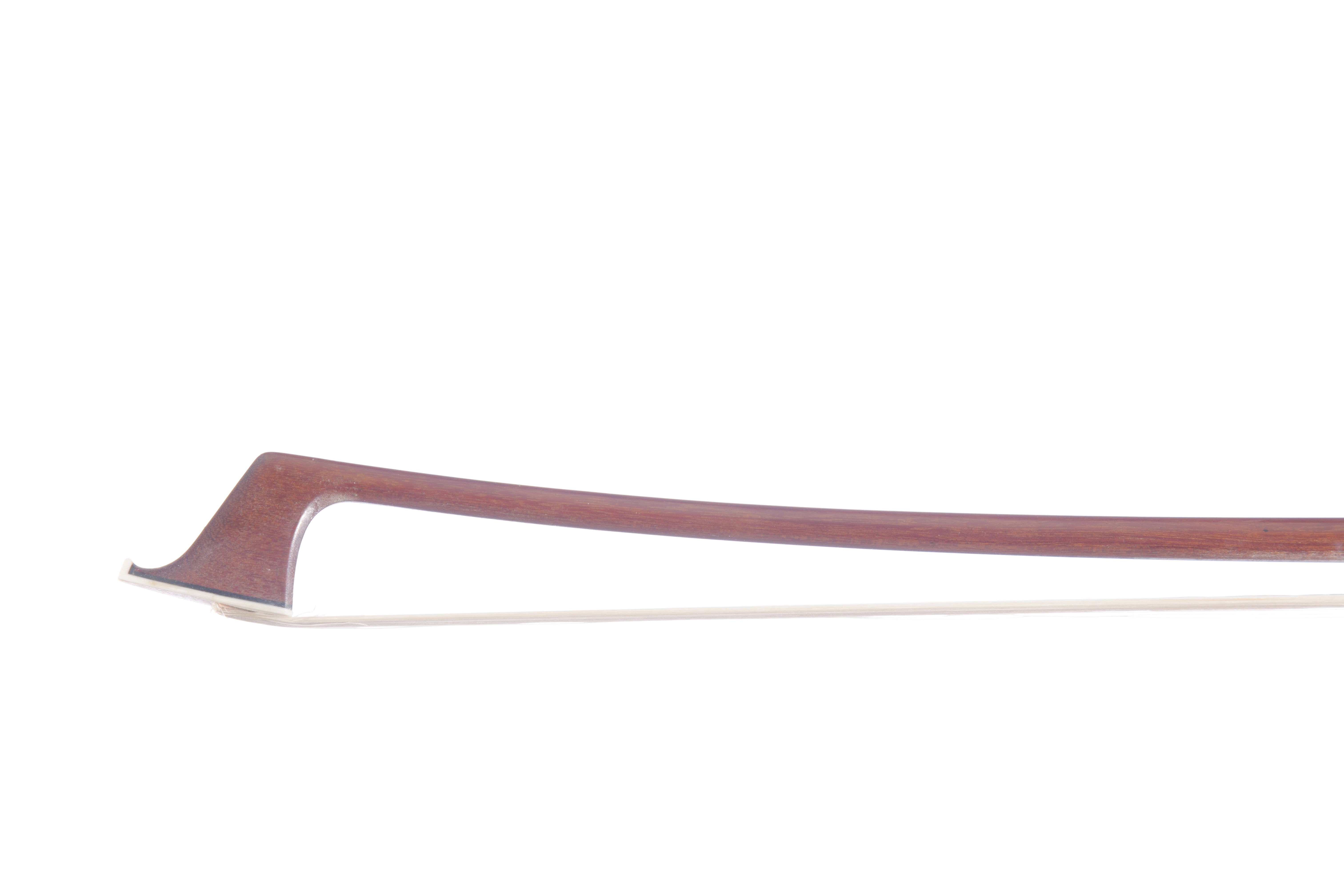 Archet de violoncelle Schmitt-Leclair, dont il porte sa marque au fer. Baguette ronde en beau bois de pernambouc, hausse ébène, avec grain montée argent. 698 mm, 78g. Avec sa facture de Jean Frédéric Schmitt maitre Luthier.