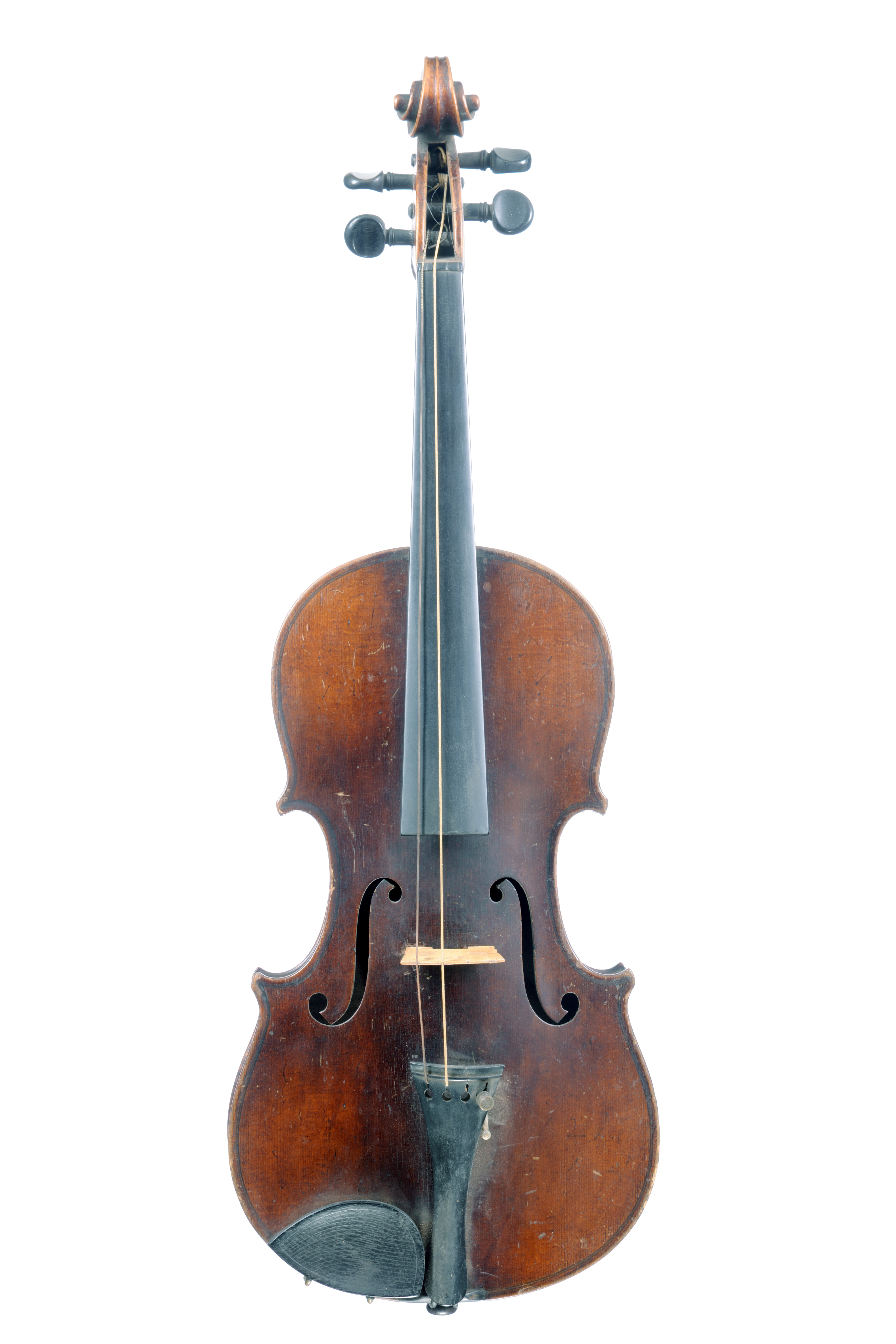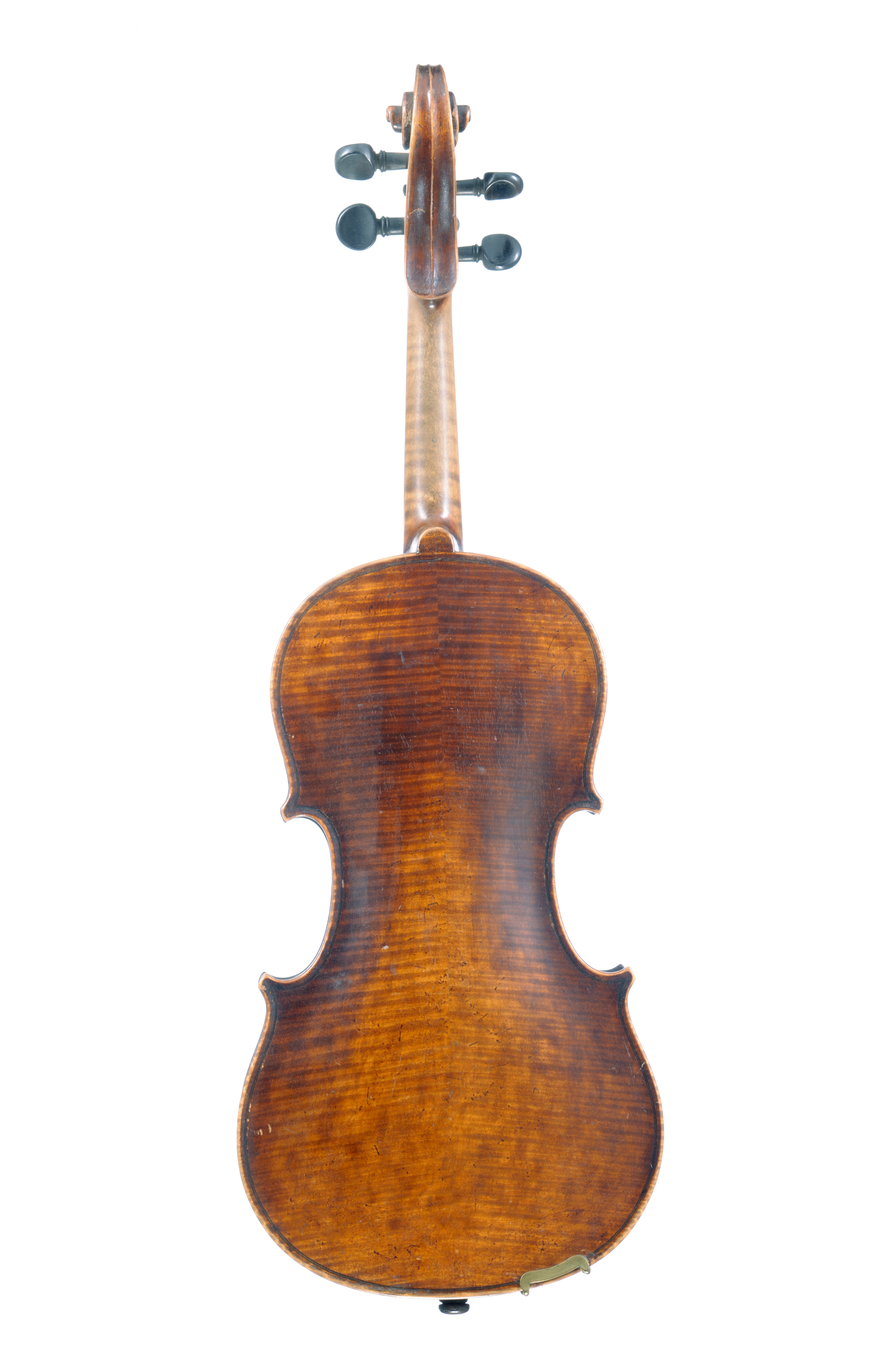 Violon anonyme fait vers 1900. Fond de deux pièces aux ondes fines et régulières. Vernis brun foncé sur fond doré.