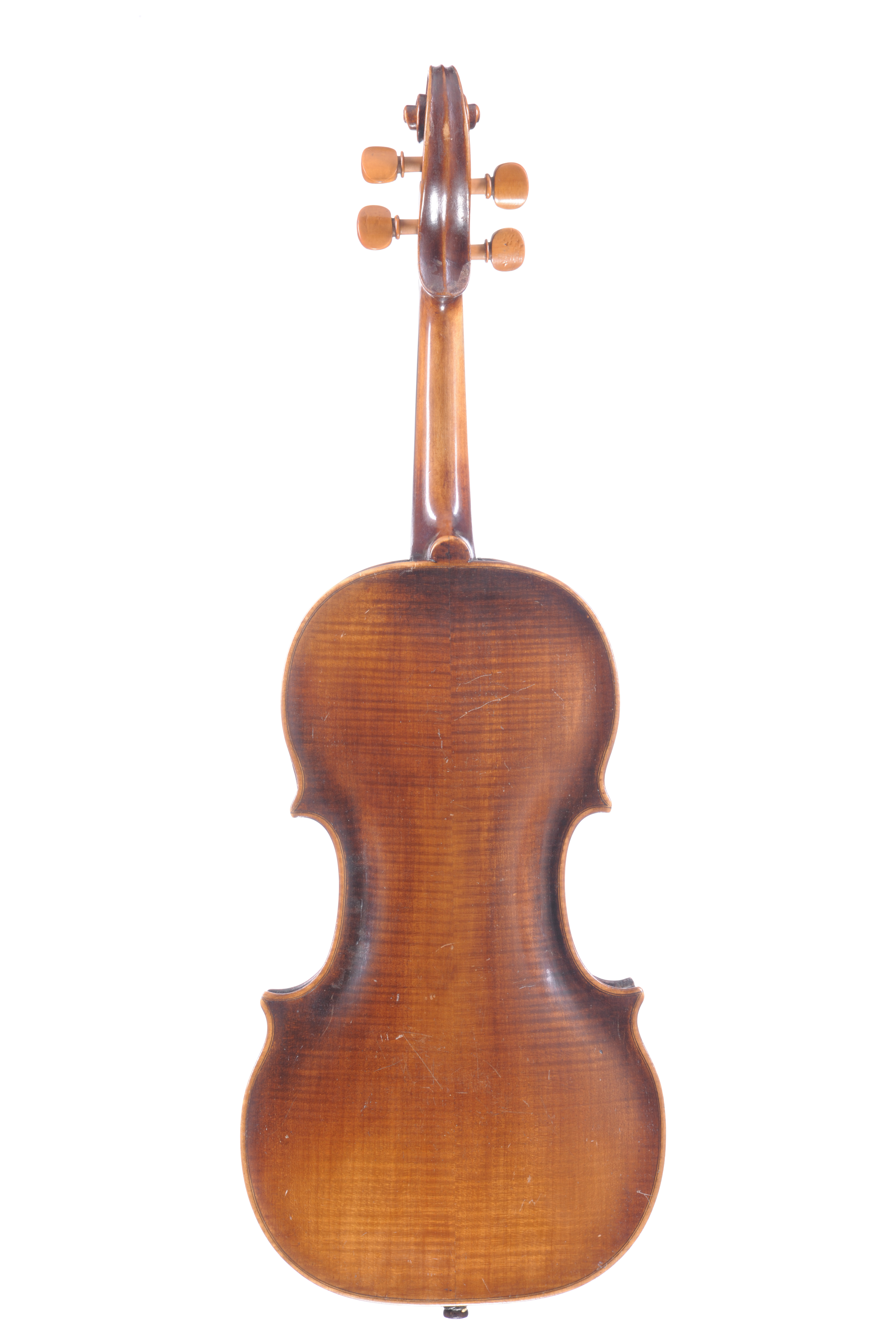 Violon allemand fait au XIXe siècle. Anonyme. Fond de deux pièces aux fines ondes. Ouies déplacées. Vernis brun foncé sur fond doré. 357 mm.