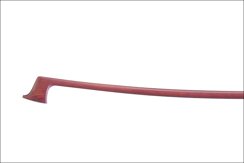 Archet de violon école de Peccatte. Baguette en beau bois d'amourette accidentée à la tête. Hausse ébène montée maillechort. 718 mm, 51,3 g sans mèche ni garniture.