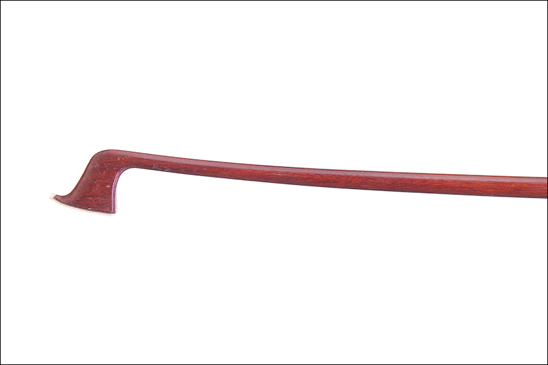 Archet de violon portant une marque au fer de Bosame. Baguette en pernambouc. Hausse ébène montée maillechort. 725 mm, 55,5 g sans mèche ni garniture.