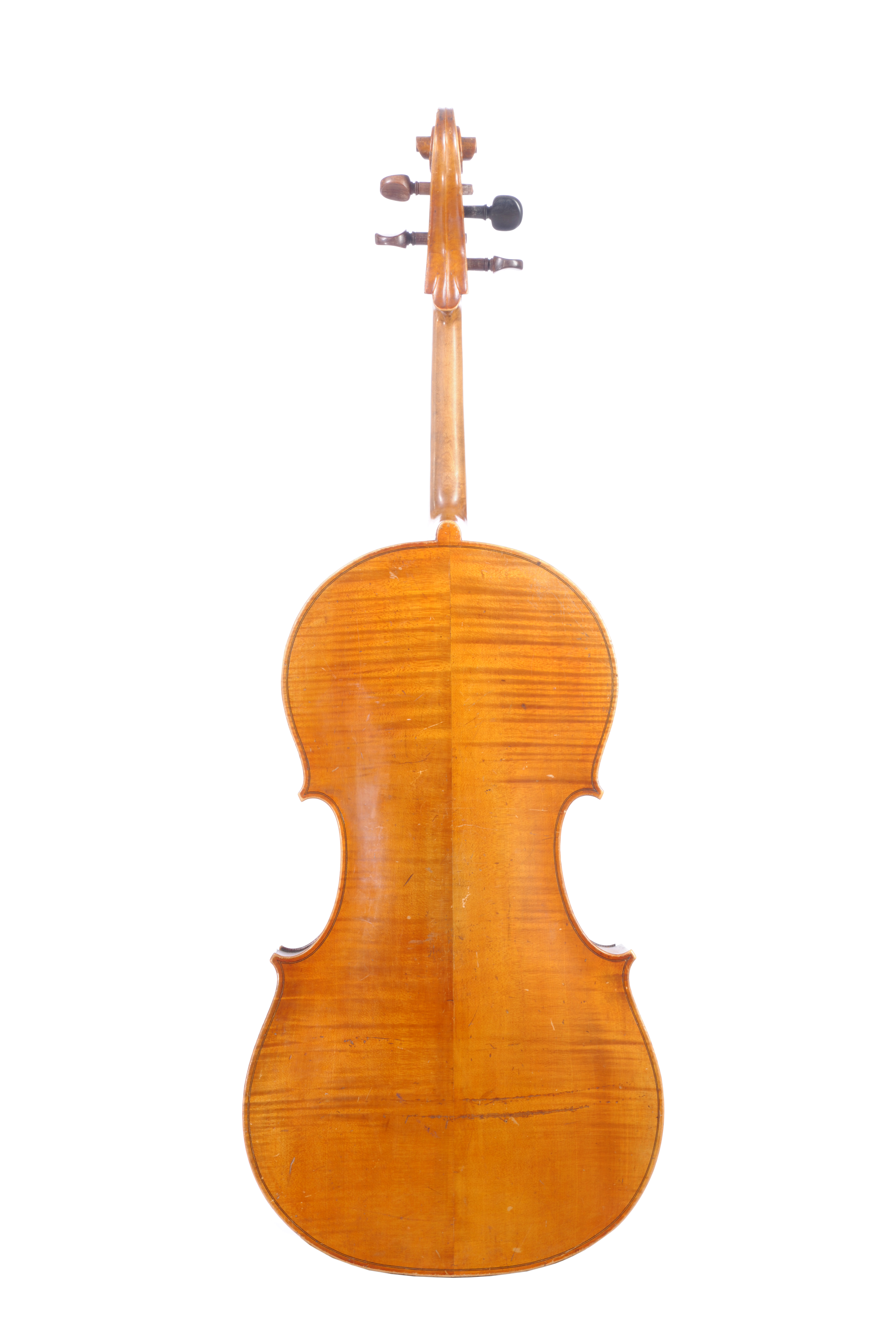 Violoncelle fait à Mirecourt portant une étiquette de Stradivarius, Coins et bords à revoir.Fond de deux pièces en bel érable ondé, 705 mm.
