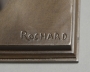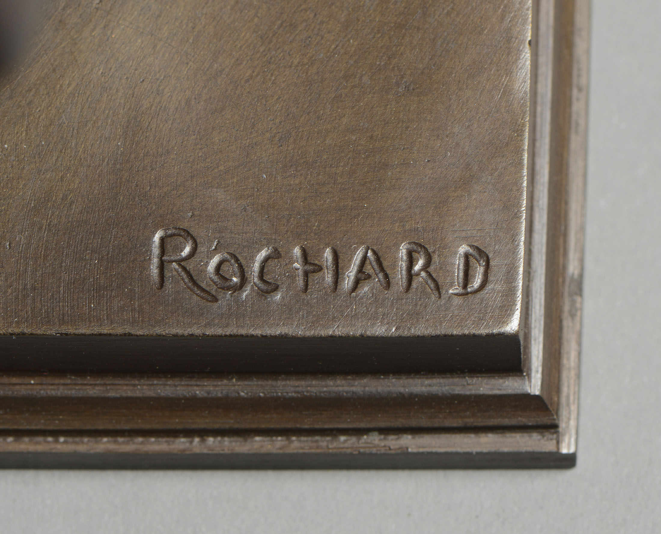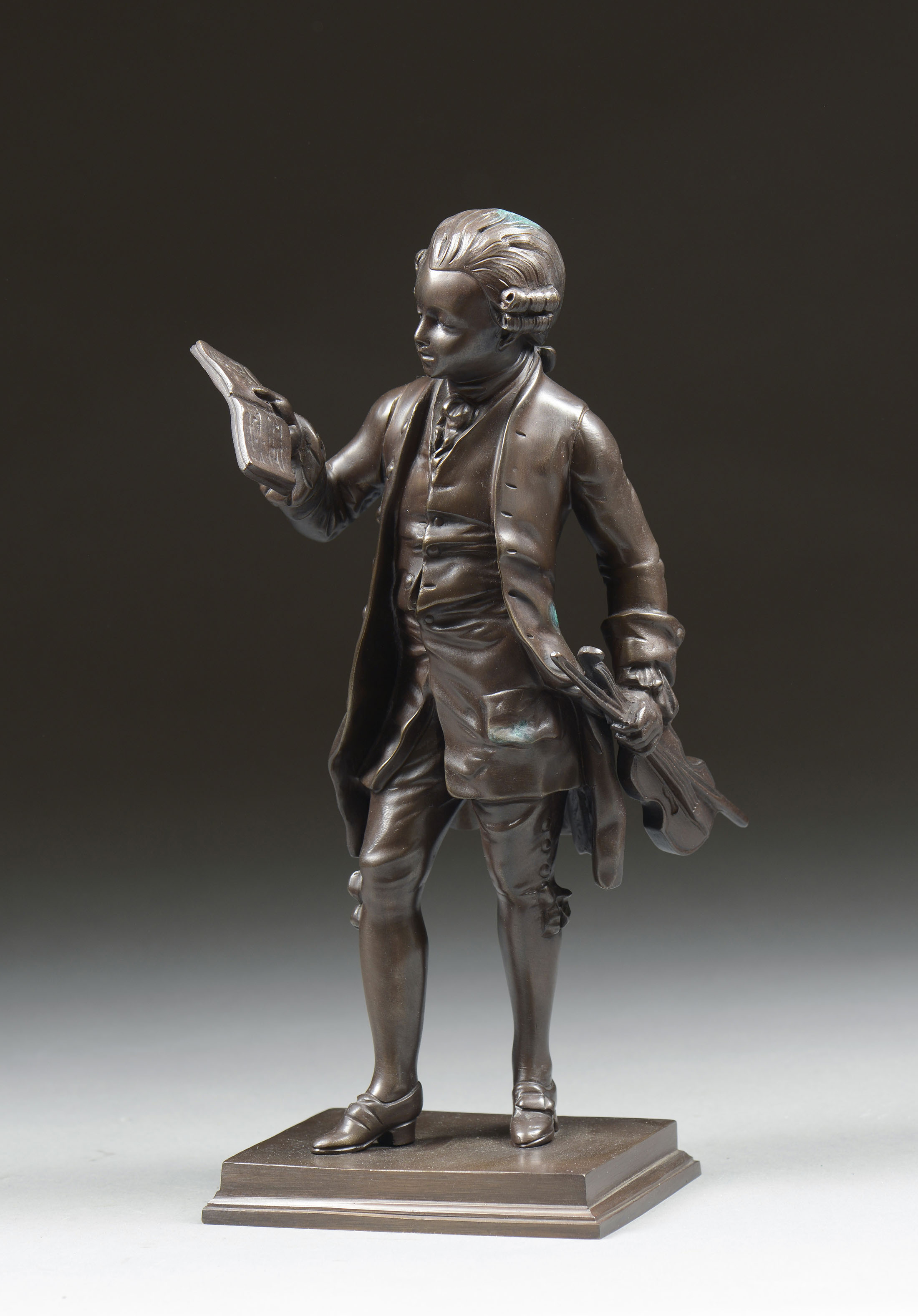 Bronze à patine brune figurant le jeune Mozart portant un violon et un livret de partitions. Signé ROCHARD portant le N° 1291, 280 mm.
