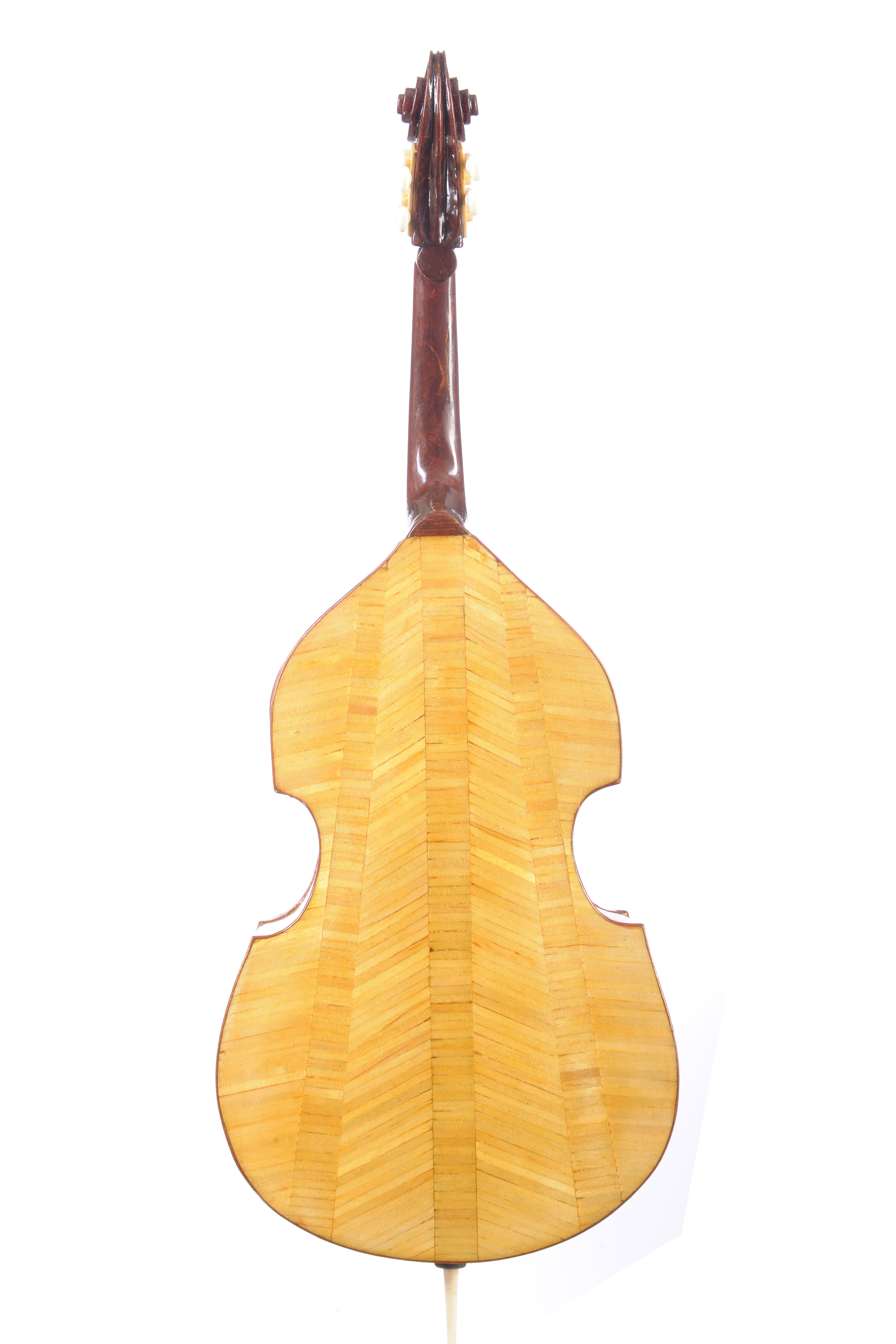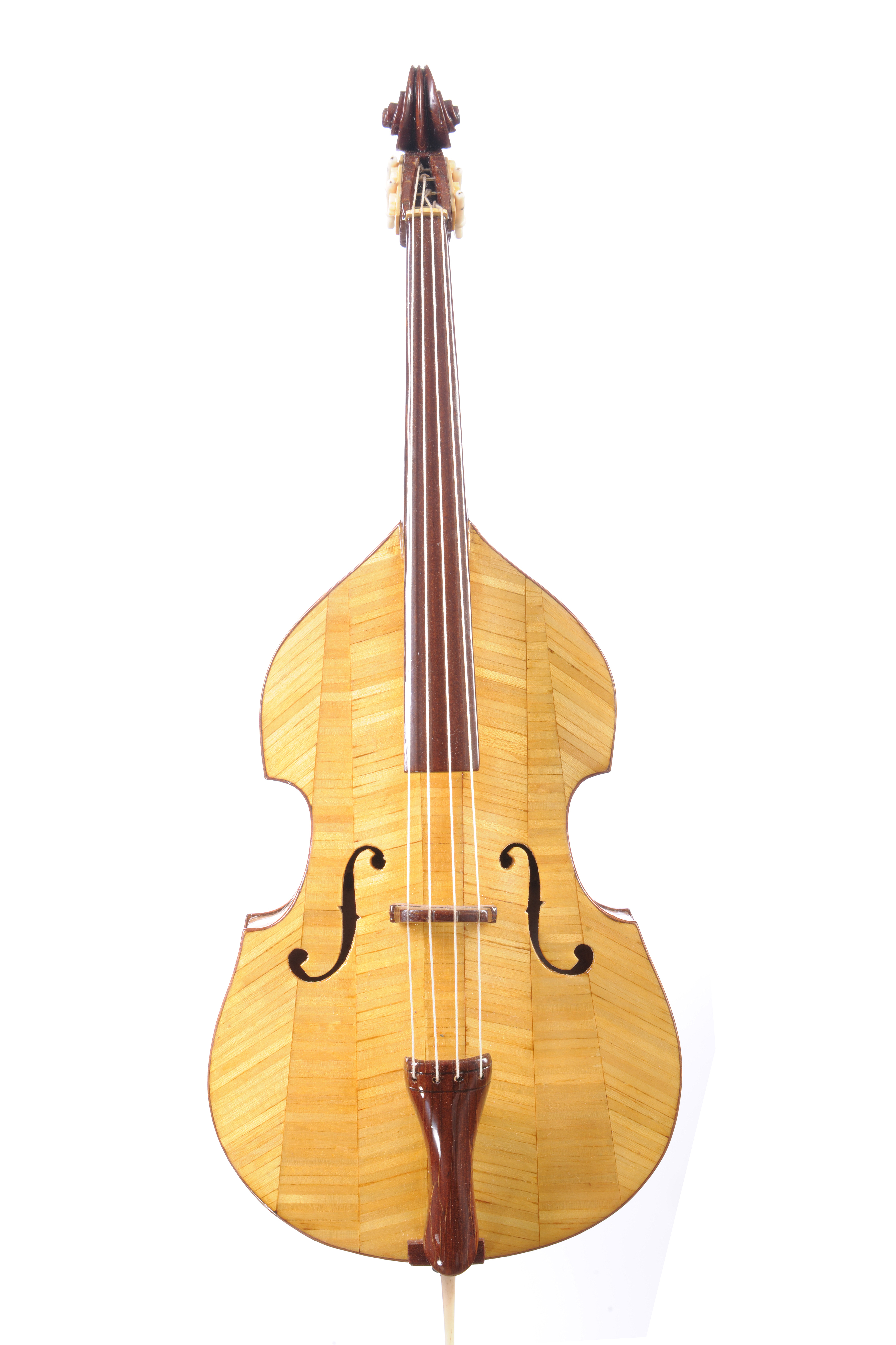 Belle petite maquette d'une contrebasse à quatre cordes, en bois clair, accessoires en or, pièce unique d'Alain Barbier. Réalisée en 1990, 345 mm.