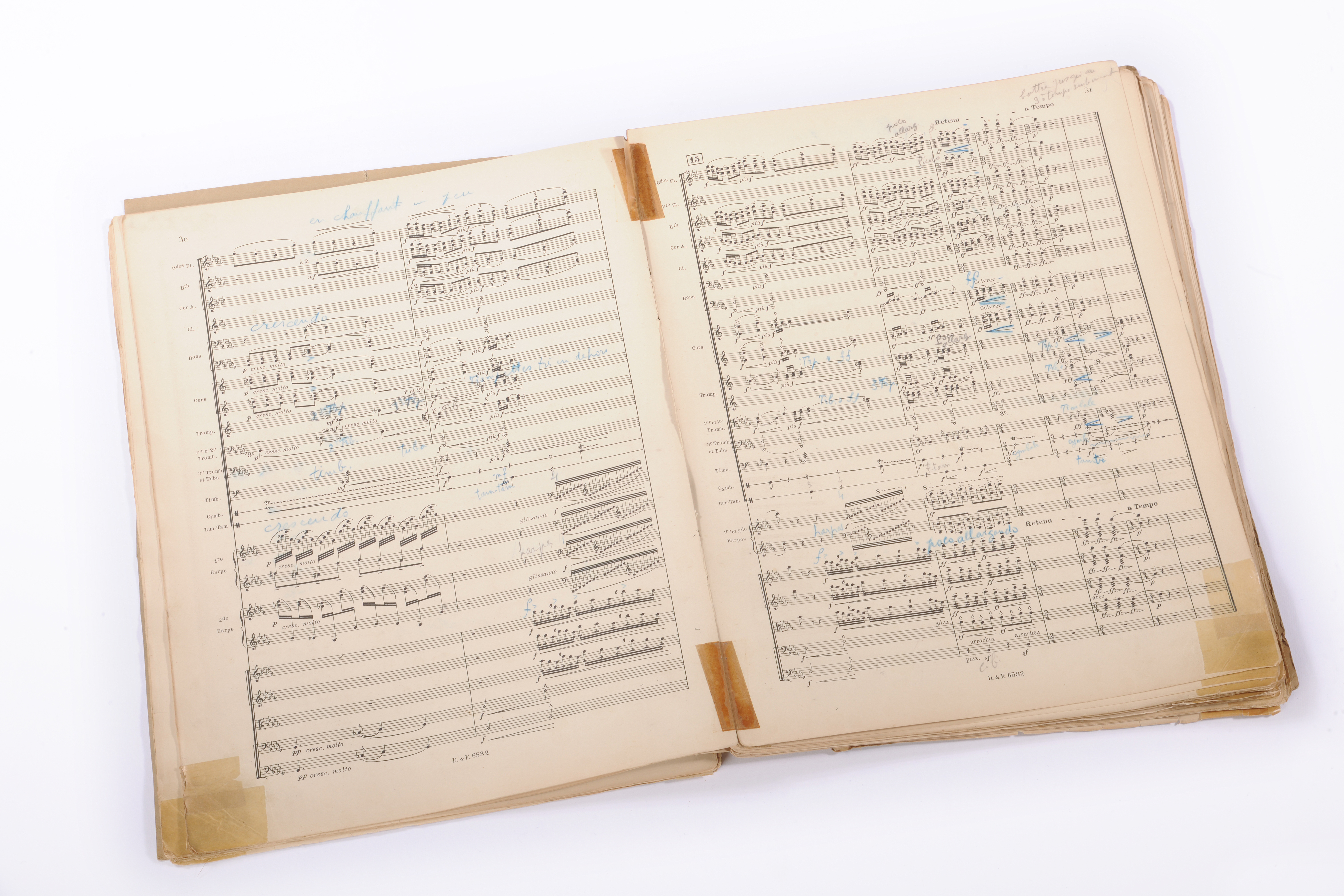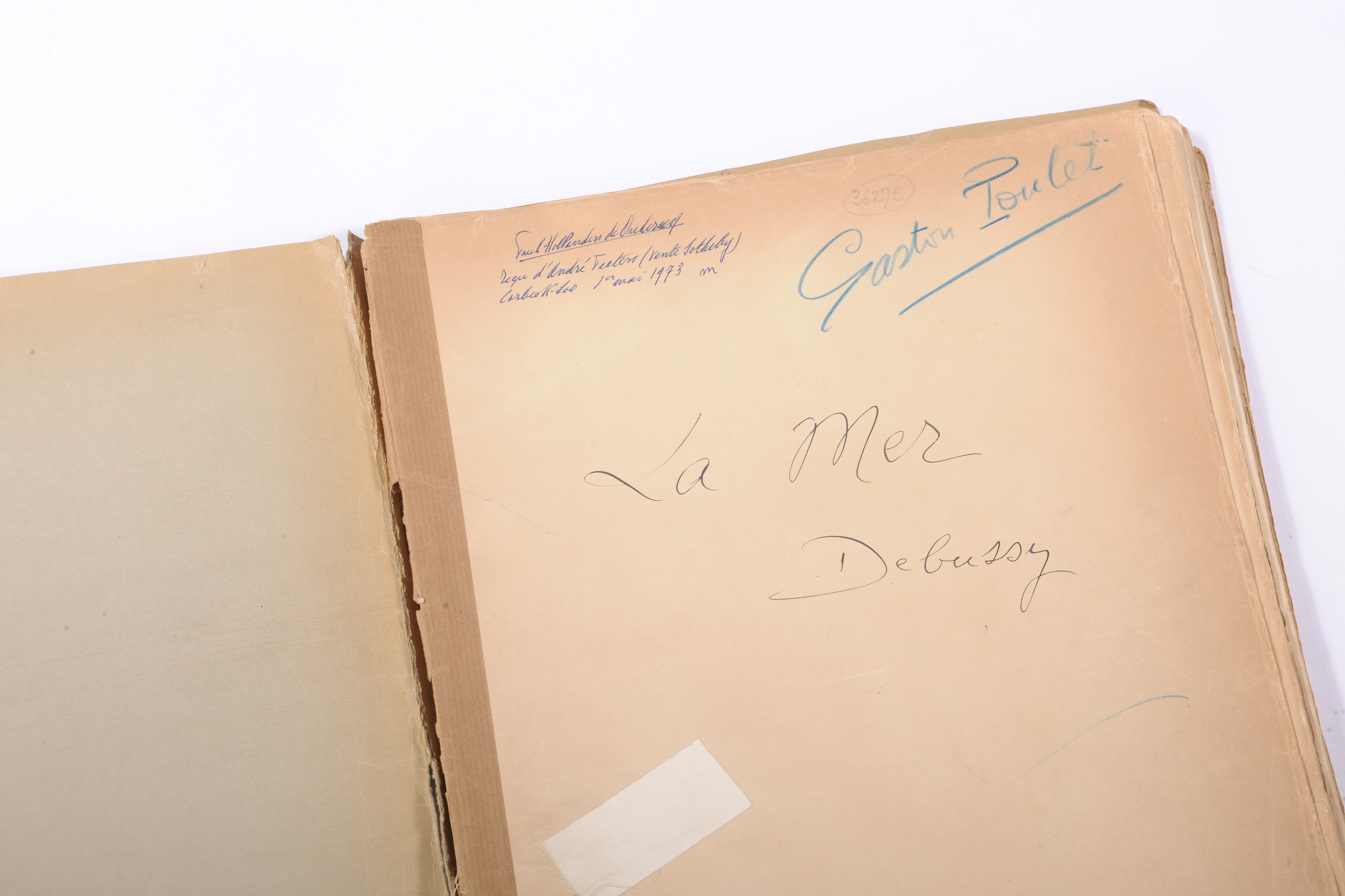 Édition originale de la version révisée par Debussy de la partition d’orchestre, exemplaire du violoniste et chef d’orchestre Gaston Poulet (1892-1974), créateur de la Sonate pour violon et piano de Debussy en 1917 avec le compositeur au piano. Nombreuses annotations manuscrites aux crayons noir et bleu, vraisemblablement de la main de Gaston Poulet, très nombreuses réparations au scotch, néanmoins une relique musicologiquement fort « parlante ». Provenance : vente Sotheby’s 1973
